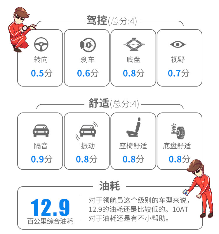 领航员的转向圈数比较多,因此在调头和大角度转弯时不是太方便,而且方向盘的直径也比较大,对于激烈驾驶来说,这个转向不是太适合,而且领航员这样有着高车身和非承载车身的车型,在运动性方面天然处于劣势,因此领航员不适合激烈驾驶,不过由于前双叉臂/后多连杆悬挂的支撑性还是不错的,加上动力足够强劲且响应快速,真的想开快车的话领航员也是能够胜任的。