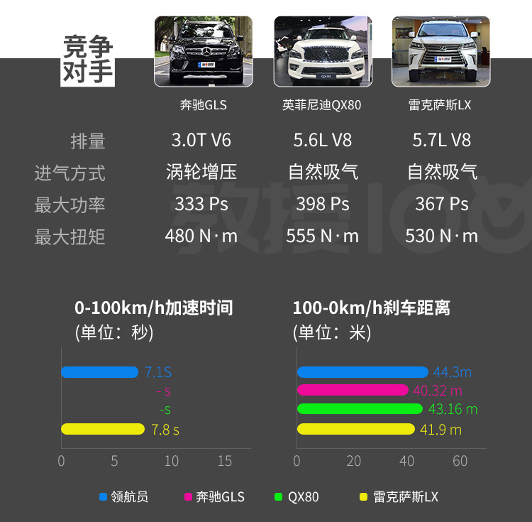 不过刹车成绩就不如加速那么优秀了,44.3米的刹车距离只能算是一般般,相比较奔驰GLS和路虎揽胜来说,领航员的刹车成绩也要差一些。