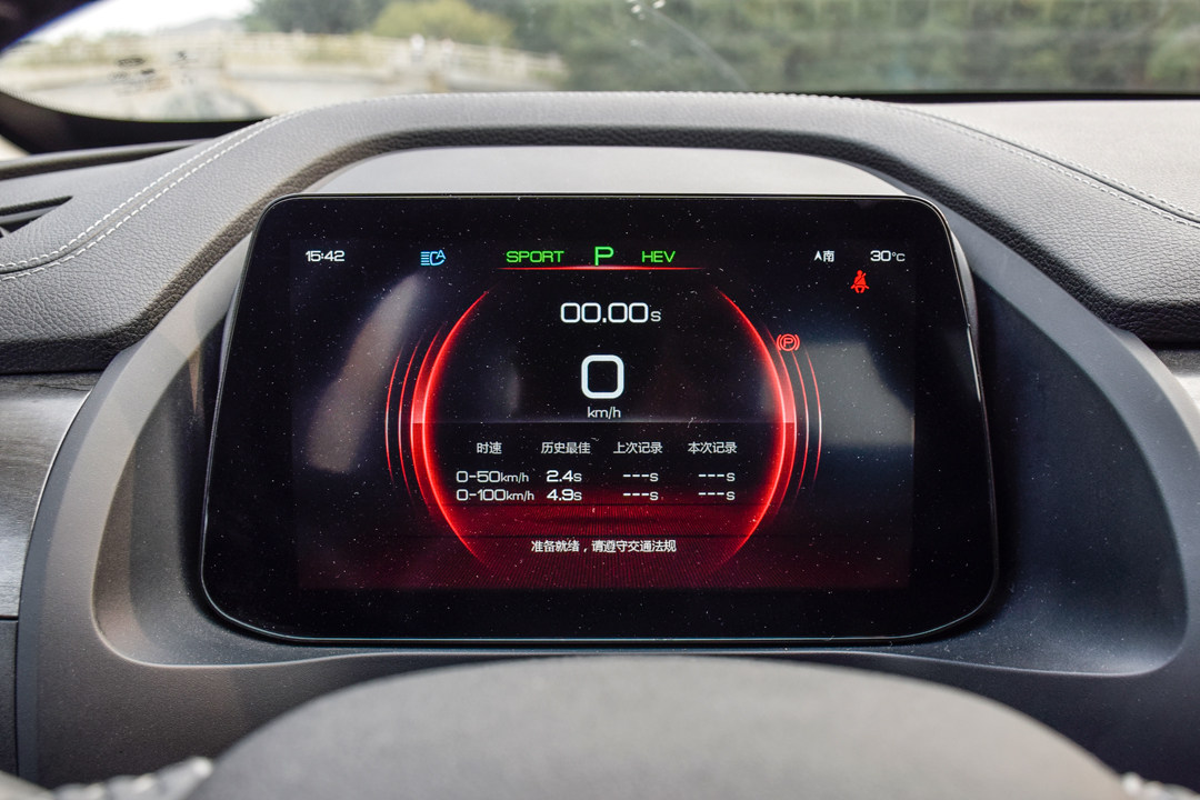 教授此前对于秦是只听闻过5.9秒威名,还没体验过,终于能一试本尊,结果让教授有点小惊喜。首先在满电状态下,一开始测得百公里加速6秒和6.2秒,在SPORT+HEV模式下,电机和发动机的巨大扭矩同时输出到前轮瞬间就会突破轮胎抓地极限然后疯狂打滑,多次尝试后前段不要地板油,让电机把车身弹出去后再全力加速,最终取得5.9、5.8还有最快的5.7秒。