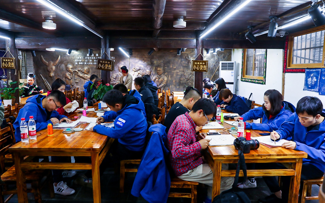 而我们也有机会体验了把传统的蜡染技艺。蜡染 是少数民族民间传统纺织印染手工艺,用蜡刀蘸熔蜡,绘花于布后以蓝靛浸染,然后用沸水去除蜡,布面上就会呈现出蓝底白花或白底蓝花的多种图案,同时在浸染中,蜡会自然龟裂,使布面呈现特殊的“冰纹”。蜡染艺术作品在整个染织界久负盛名、独放异彩,尤具魅力。