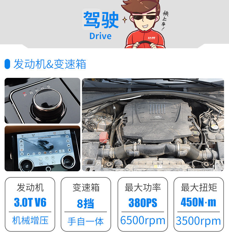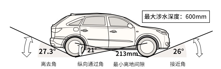 揽胜星脉的接近角和离去角在城市SUV中算挺大的,213mm的离地间隙也足够高,600mm的涉水深度足以应付市区水浸的路况。揽胜星脉具备一定的越野能力,当然,市区才是他真正的归宿。