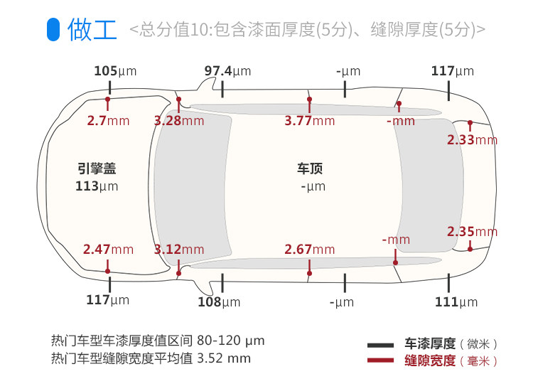 M4的漆面厚度表现只能算是普通水准,不过在钣金水平方面还是不错的,全车缝隙都没有超过4mm,符合豪华车应有的表现,此外,我们这台M4还有配备碳纤维车顶,因此没有天窗,也没有车顶的漆面数据。