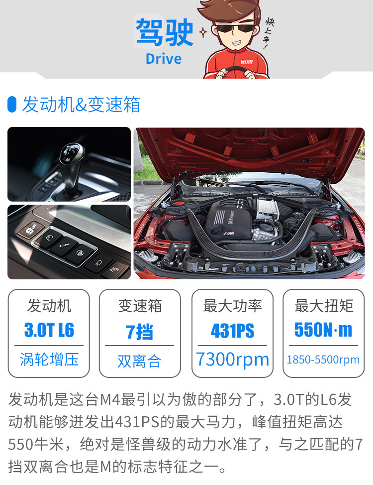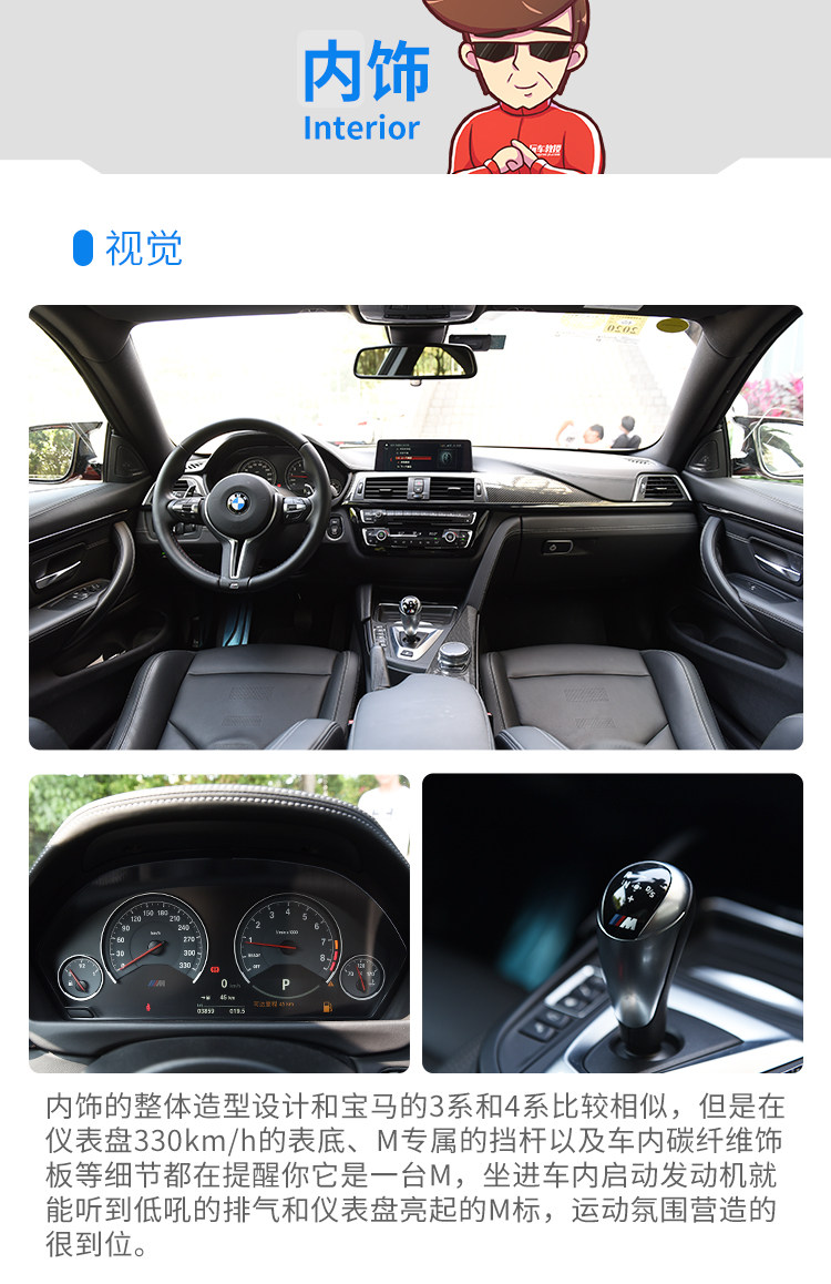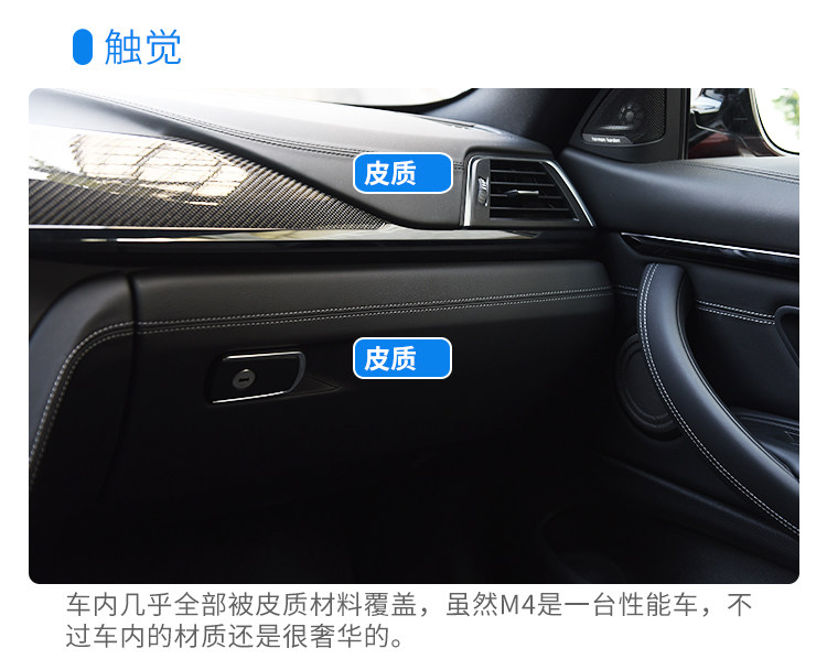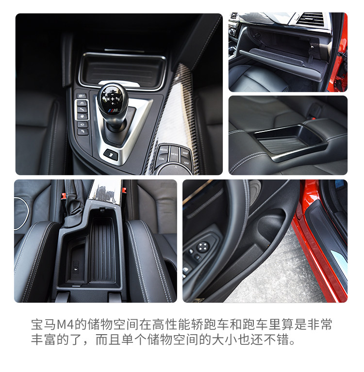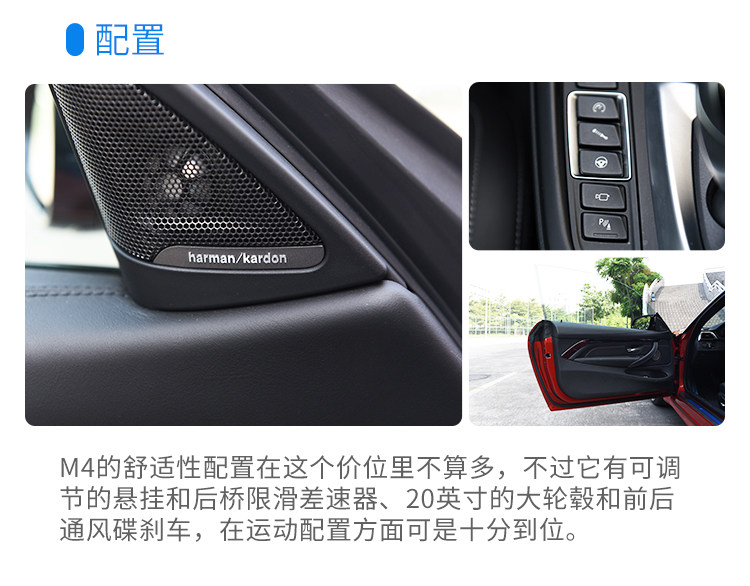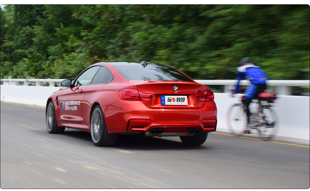 M4的马力并不算暴力,它就是能刚刚好把你挑逗得热血沸腾,并且和底盘完融合。C63和M4来说,我一定选M4,因为M4要玩能玩得很疯,要日常买菜舒适度又完爆C63,宝马对M4的悬架和转向调校可谓能文能武。把转向调到舒适,转向力度立刻轻柔很多,和普通3系几乎一样,你会有一种错觉在开一辆430,当然底盘和动力以及排气都好很多,但你以为M4不过如此?你错了!把各个选项都调成战斗状态,一脚油门到底就能让你倒吸一口气,排气声浪虽然不是我喜欢的音韵,但真的好响,响到十米之内能把路人吓得弹开半米!换挡很快,无论是自动还是手动拨片都快得难以置信。弯道精准的转向手感不必说,车辆底盘硬而有韧度,极限很高,但是千万小心,后驱400多马力不是开玩笑的,如果你技术够好,可以开始各种反打操作了。M4的刹车非常棒,和普通430比起来那是质的不同,前段超级灵敏,后段持续发力,不会衰减,这让人很有信心,可以随心所欲拉高转炸街,却不用担心你的车刹不住。M4也许不是同级最快的,但它那种驾驶乐趣魅力爆表,我对它最深刻的印象在于,让我玩得血脉偾张之后,又能立刻安静下来,成为一辆430,轻柔的转向,优秀的行驶质感,这种功力着实让人欲罢不能,我们不可能每一分钟都在赛道上,所以我更爱全能的M4。