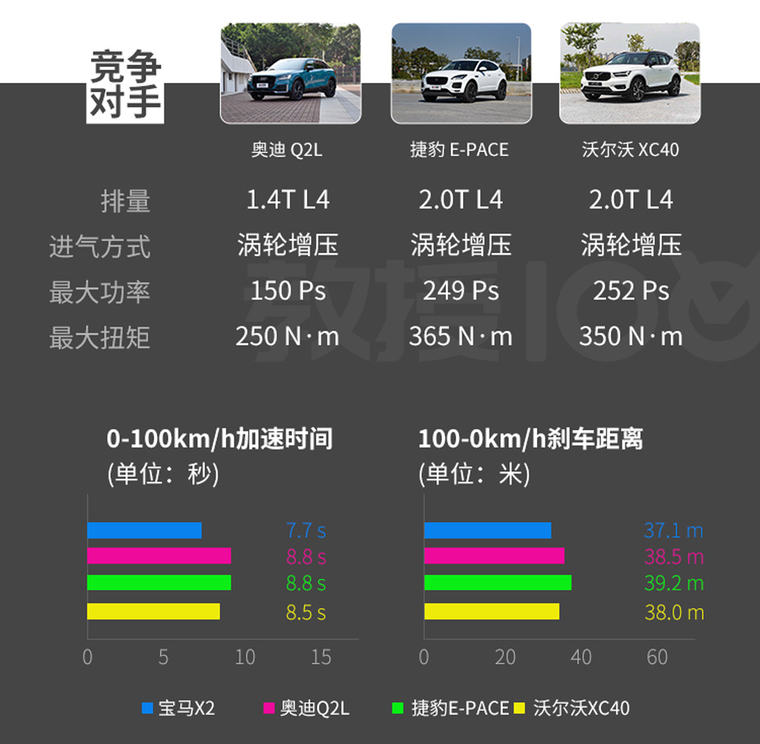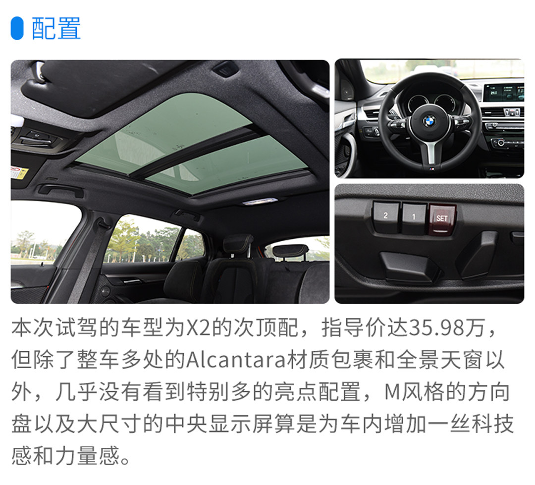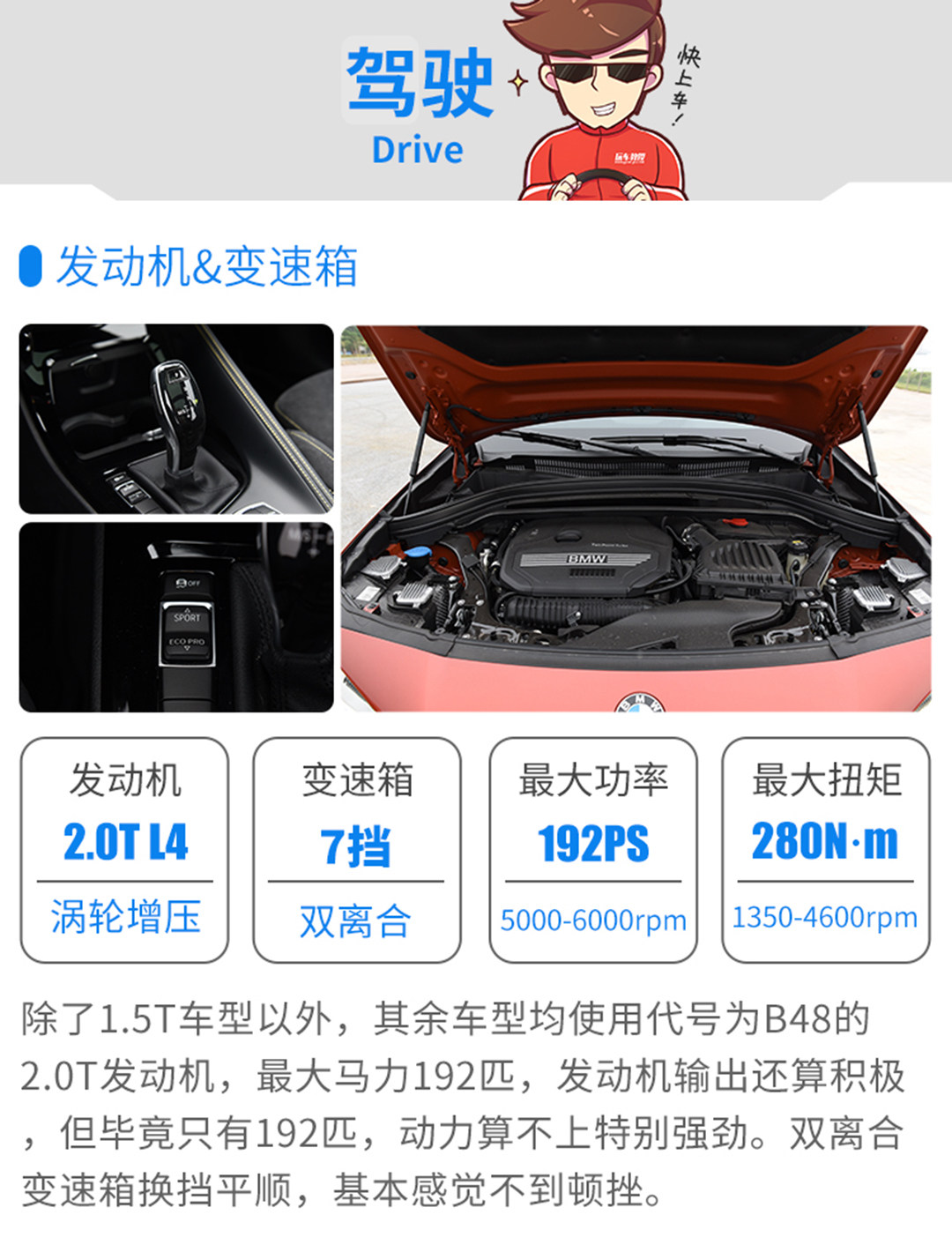 宝马X2开起来很灵性,转向有着宝马的精准,而且底盘支撑性相当足,发动机输出毫不留力,只要你敢踩,发动机即便用力嘶吼也给你相应的加速力,不过你要求它很快地达到你想要的速度基本不可能,毕竟只有192匹的动力,而且需要拖动庞大的SUV身躯。