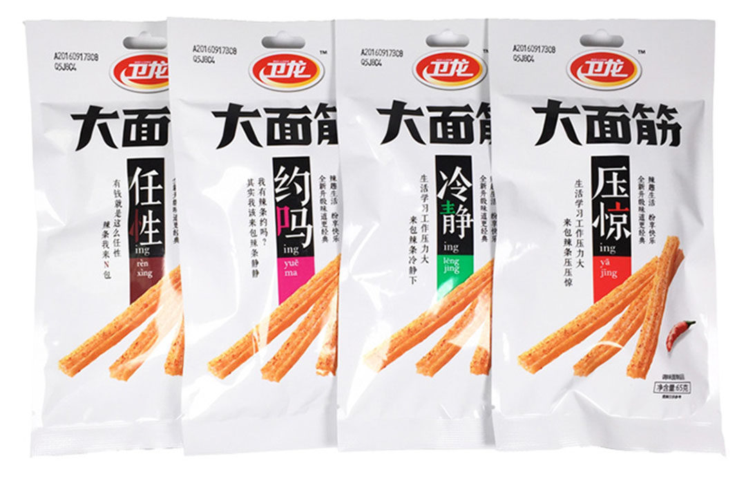 这个辣条看上去并未有什么不同,但是包装比较简洁,以黑白为主的配色给人一种舒服的感觉,上面贴近网络语的文案也非常亲切,一看就不是普通的辣条,没错这就是大名鼎鼎的卫龙辣条。尽管卫龙辣条还是熟悉的味道,但因为在设计、包装、文案的升级,卫龙的溢价提升了好几倍但是仍然不愁卖,这就是消费者升级。(麻烦卫龙过来谈谈广告费的事)