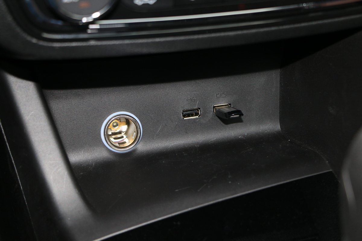 东南A5翼舞中控台下有两个USB接口,一个点烟器接口,在实用性方面完全没问题。但是这块的空间不大,塞个手机可以,但是它的表面光滑,而且很平缓,如果上车后把手机放在这里,下车的时候要在地板上找一下手机。