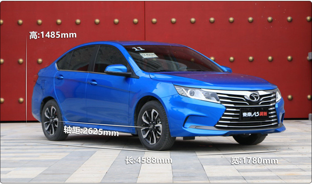 东南A5的长宽高分别为4588*1780*1485mm,轴距是2625mm,是很典型的A级车尺寸表现。