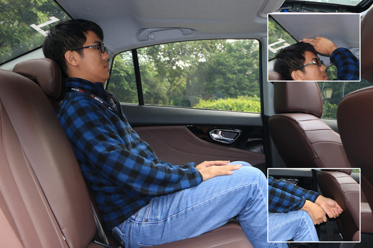 同一个体验者坐进后排,腿部有两拳的空间,头部有两指,这乘坐空间的表现可以说非常惊喜。要知道,东南A5翼舞的尺寸并不大,而且后面采用的是多连杆独立悬挂!