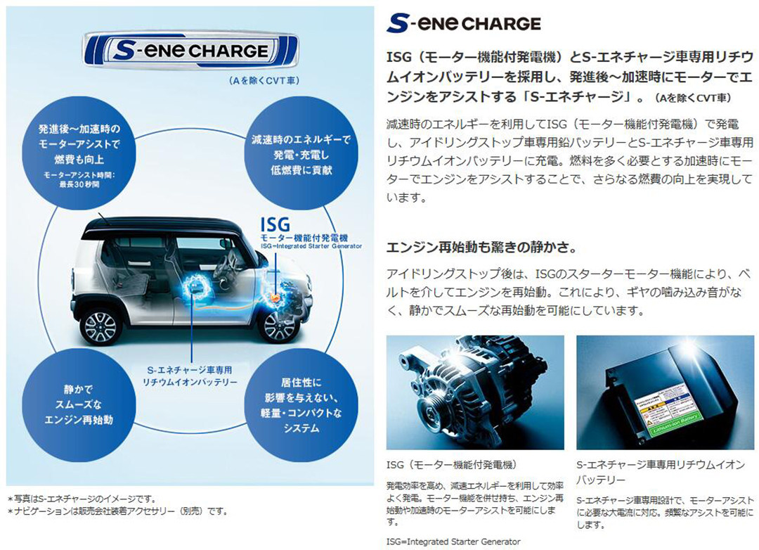 不过说到这台车发动机最大的特点不是动力,而是加入了一个名为S-ene Charge的系统。铃木使用了一个电动机,来代替了原来的发电机。当汽车进行减速和刹车时能够利用发电机进行动能回收,临时储存在电池中。而加速和起步时能够反过来利用电能驱动电动机,对发动机进行辅助。利用这种简单的油电混合能够提升动力反应和降低油耗。一般综合工况下自然吸气车型月3.1L/100km,涡轮增压车型为3.6L/100km。
