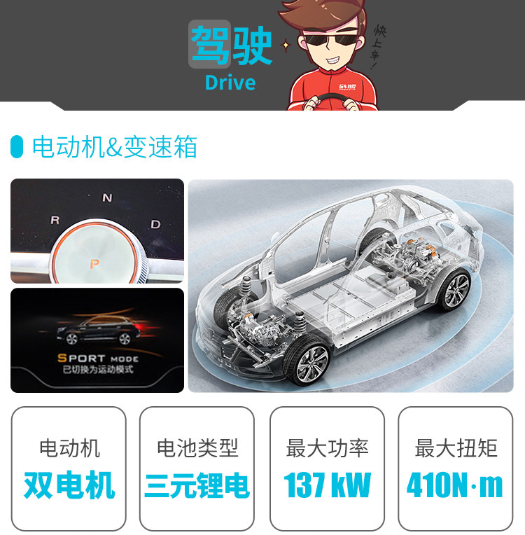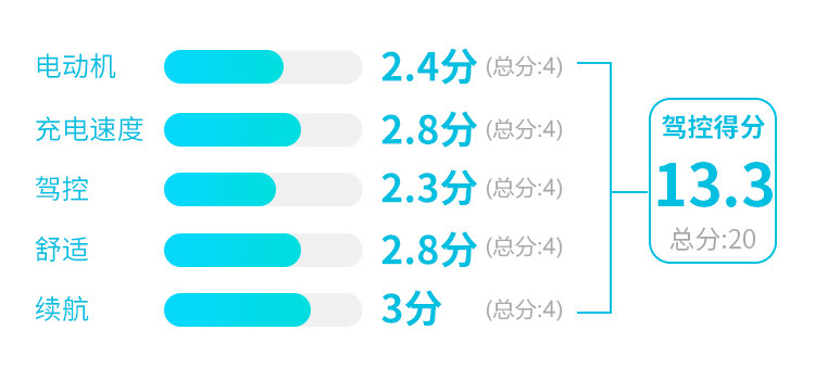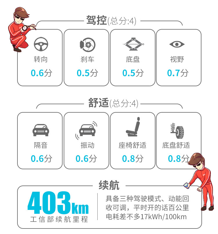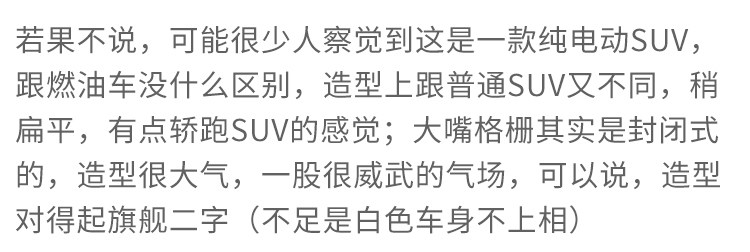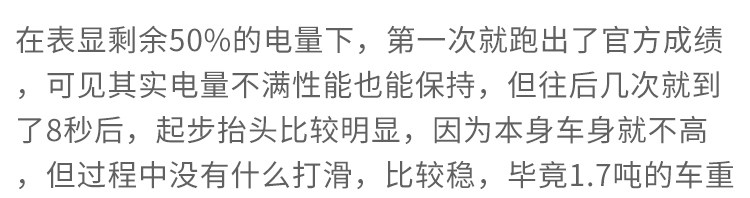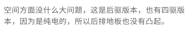 舒适的驾驶加上整车隔音不错,在车内会听到比较大的风噪,其实车内是比较安静的,这只是没有发动机声音造成的反差,但这份静谧加上不错的中段提速能力的话,如果驾驶得激烈那么会造成一点密闭空间内的晕眩感,没开惯电动车的话可能需要适应一下。