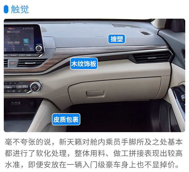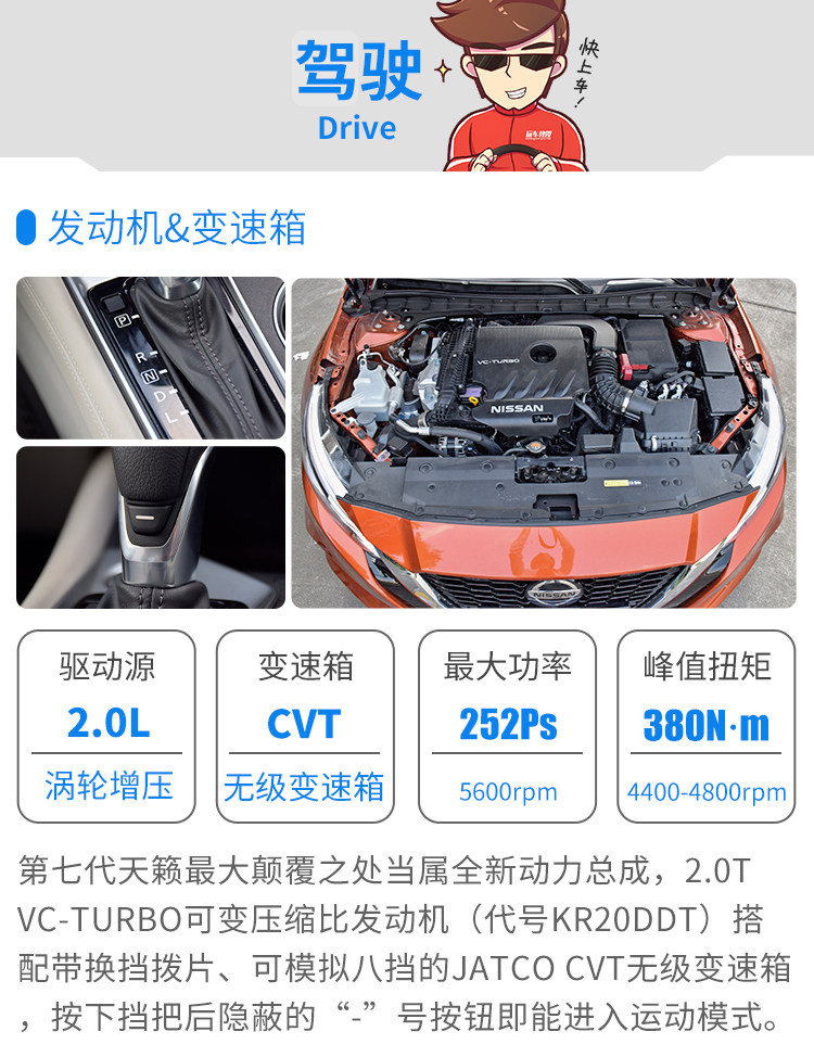 不卖关子,第七代天籁在得到英菲尼迪可变压缩比2.0T发动机下放后,动力跃升至同级舍我其谁的水平。全油门加速时,引擎高转运转时的激情、亢奋以往从未出现在日系民用车领域当中。远快于价位相近、同排量的竞品车型,让日本友商们面面相觑。