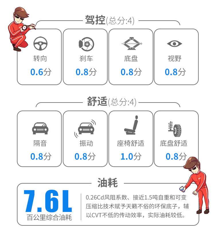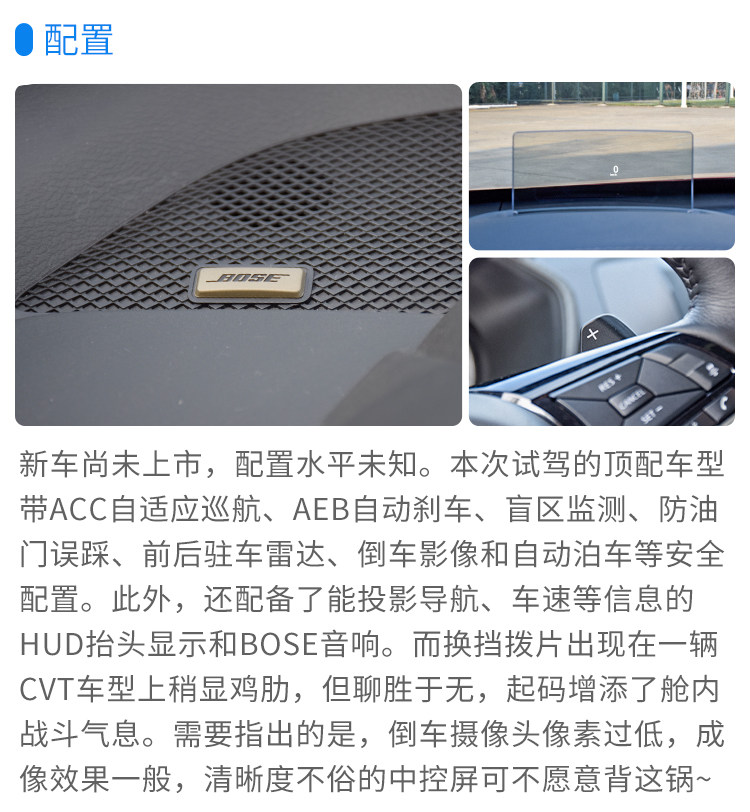 虽说Jatco这台模拟8速的CVT变速箱有着接近传统AT变速箱的表现,时速表上扬的同时转速指针攀升后的小幅回落,油门响应、动力传递积极,但平顺得“无趣”的动力线性输出,总缺少一份涡轮车应有的鲁莽。或者说,更像是在驾驶一辆3.0L V6自吸轿车。