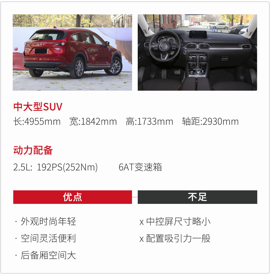 总的来说,价格和动力可能是CX-8最大的软助,而外观和内饰则为最大亮点,但是由于外观内饰在绝大部分情况下,都是见仁见智的,所以CX-8的综合竞争力确实不强。