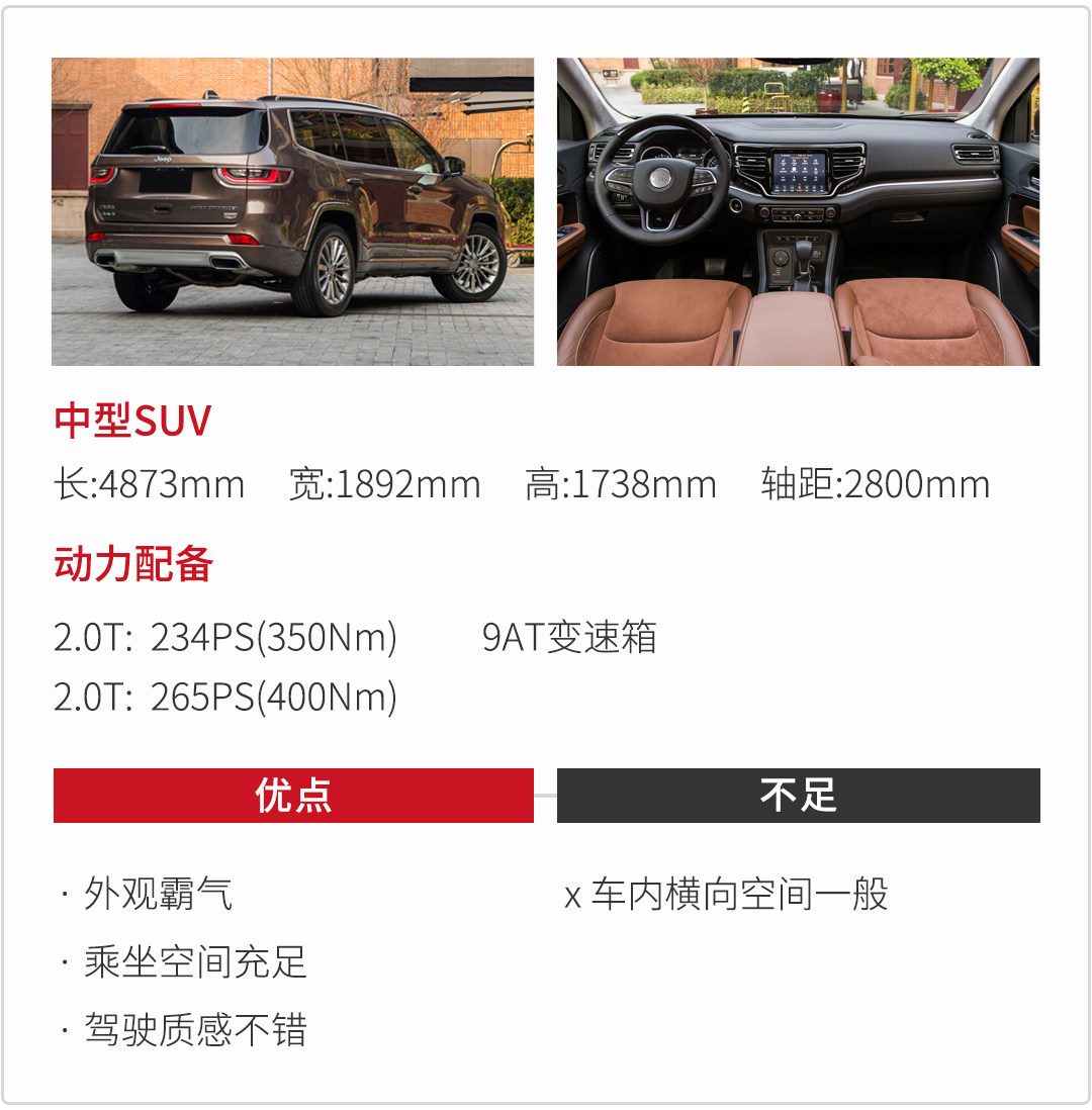 说了两款日系品牌的7座SUV,再来看看老美的。相信有情怀的买家也不占少数,Jeep大指挥官的品牌力相比以上两款车型,一点都不显逊色,但如果你说这是优势,那也不至于。再说大指挥官的形象,大气稳重的造型,不愧是Jeep第一款专为中国消费者的审美而打造的。价格方面也基本是汉兰达的水平,但是最近上市的四驱悦享版,28.98万就能买到的2.0T高功率发动机+9AT+四驱系统确实非常吸引。