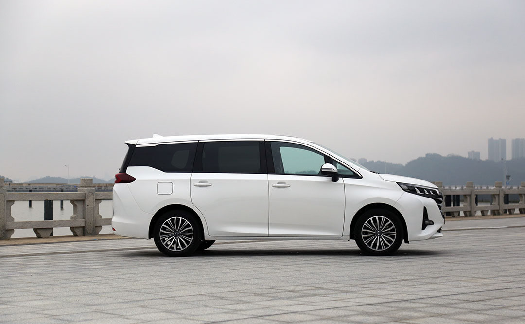 车身侧面比较简洁,海豚跃动设计理念的车身腰线从车头贯穿至车尾。悬浮式车顶可以说是当下非常流行的设计了,在减少商务气息的同时,也增加了一些美感。但是遗憾的是,GM6并没有采用传统MPV车型使用的侧滑门,而是采用侧开门。