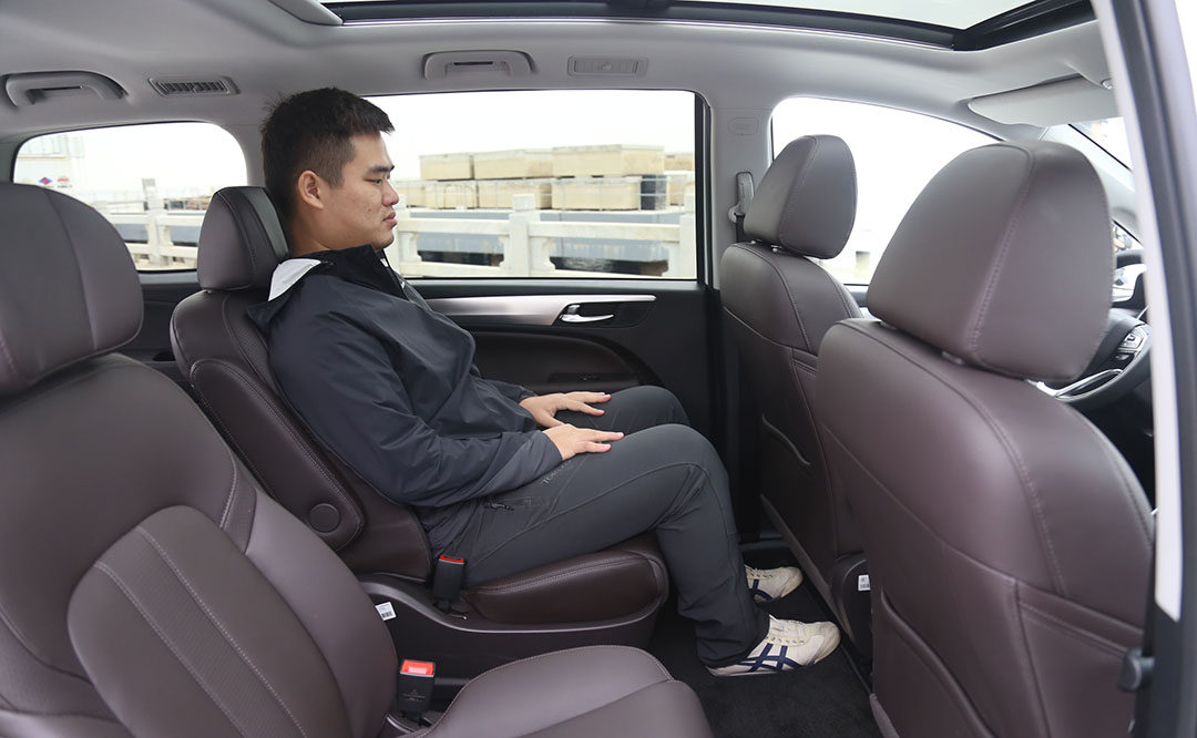 第二排座椅的位置对于MPV车型来说也尤为重要,将第二排座椅调整到距离前排两拳的位置。座椅的填充偏软,中间有个扶手可供支撑。中间过道的距离宽达190mm,方便第三排乘客进出。