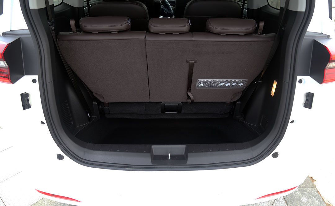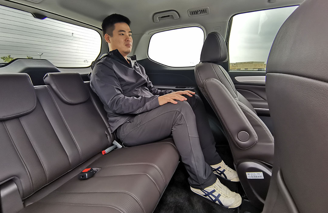 第三排的空间虽然有点局促,但是在一个接受范围内,前面两排座椅的位置不动,腿部还有一拳左右的距离,头部也没有顶到,整体表现还是不错的。