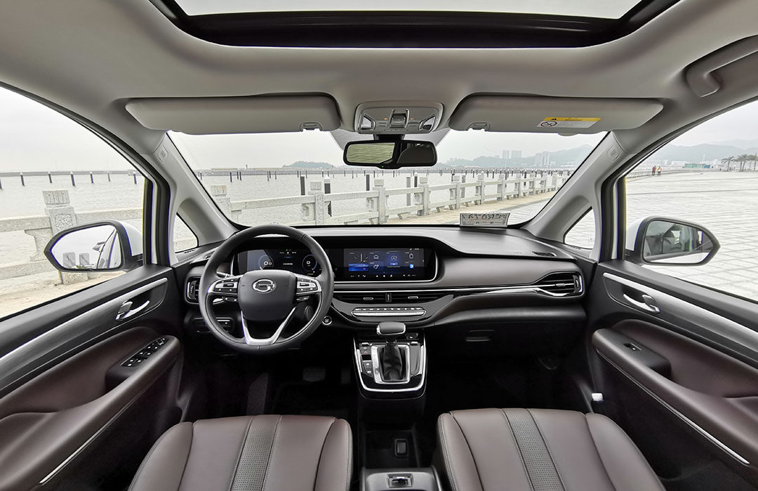 内饰方面比起GM8要更加有科技感一点,采用智能家居风格设计,多媒体显示屏和液晶仪表盘连为一体非常吸引眼球,带有一点豪车奔驰的感觉。中控台顶部采用了硬塑料材质,中间部位采用了软性材质,无论是做工还是手感都符合了该级别的水准。前排中间还采用了MPV车型常用的贯通式设计。