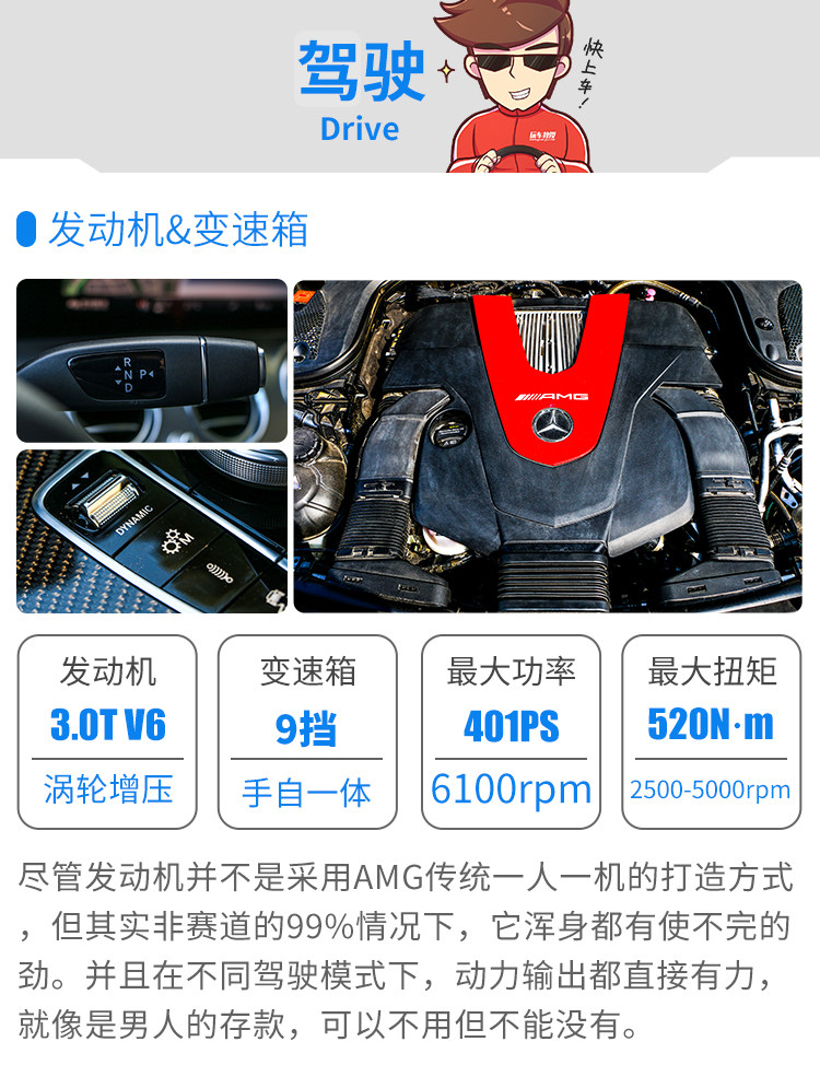 但当你把驾驶模式调至sport或者sport +的时候,AMG的灵魂则瞬间回归,所有与驾驶相关的操作都会变得相当紧致,油门踏板变得零延迟,只需要三分之一的油门开度,整个动力输出就可以一直到红线再换挡,而4.7秒的0-100km/h的加速成绩也说明它拥有相当暴躁的动力性能。