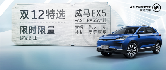 而为了更好的服务用户,随着11月28日威马汽车Fast Pass计划的热烈反响以及更多用户春节前快速提车需求,威马汽车接力推出该计划的第二波——“双12特选”活动。届时将有8款共1212台威马EX5 400创新版特定车型,从12月12日0点接受订购。用户可在威马电商平台“双12特选”活动专题页面,选择特定车型并完成大定支付,且在2018年12月26日前(含当天)在各智行合伙人处付清全款的用户,均可在2019年1月31日前提到爱车,并同时享受2018年国家及各地政策补贴后的价格,以及威马汽车直击用户痛点的666服务权益。此次参加“双12”特选活动的车型是基于威马EX5 400创新版的8款特定车型,由深色内饰搭配4款车色(秒白、云金、奥蓝、猎红)及2种选配包组成,并限量供应1212台。