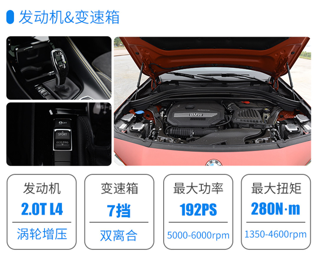 宝马X2的动力规格挺有意思,入门一款车型为1.5T配7速双离合,中间的几款车型为B48系列的2.0T配7速双离合,而顶配的xDrive25i M则搭载的是2.0T配8AT的动力规格。