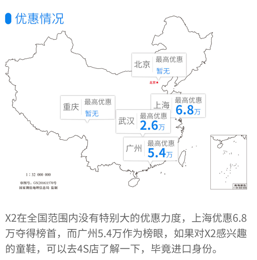 X2同样是上市新车,不过目前在各大城市已经放出了优惠,部分城市的优惠幅度还相当可观,包括上海最高的6.8万、广州的5.4万等。对于有进口车情节的消费者,其实这个时候下手已经不算太早了,而如果你还想观望,等它国产或许价格会下探,教授觉得,倒不如“早买早享受”。