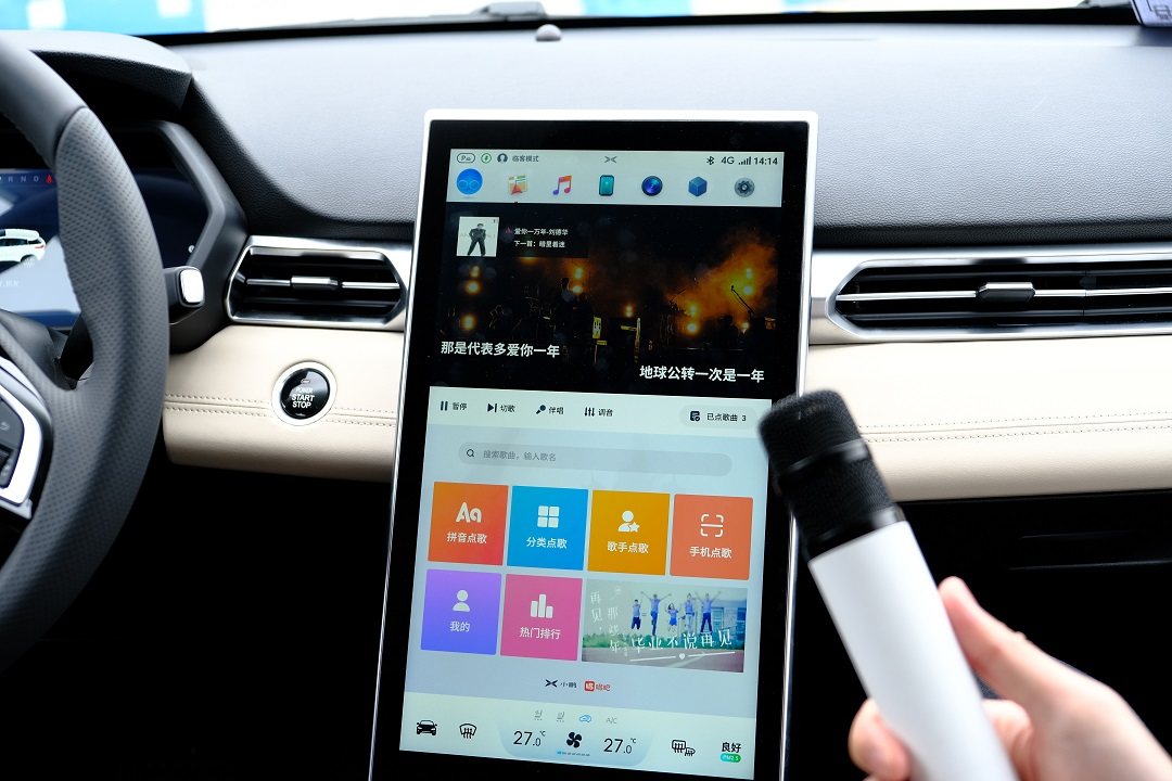 车内还有游戏、K歌功能,车载K歌是小鹏汽车联手唱吧为极智玩家打造多媒体娱乐系统,全车共配置8个扬声器,由4个高音扬声器、4个中低音扬声器组成。