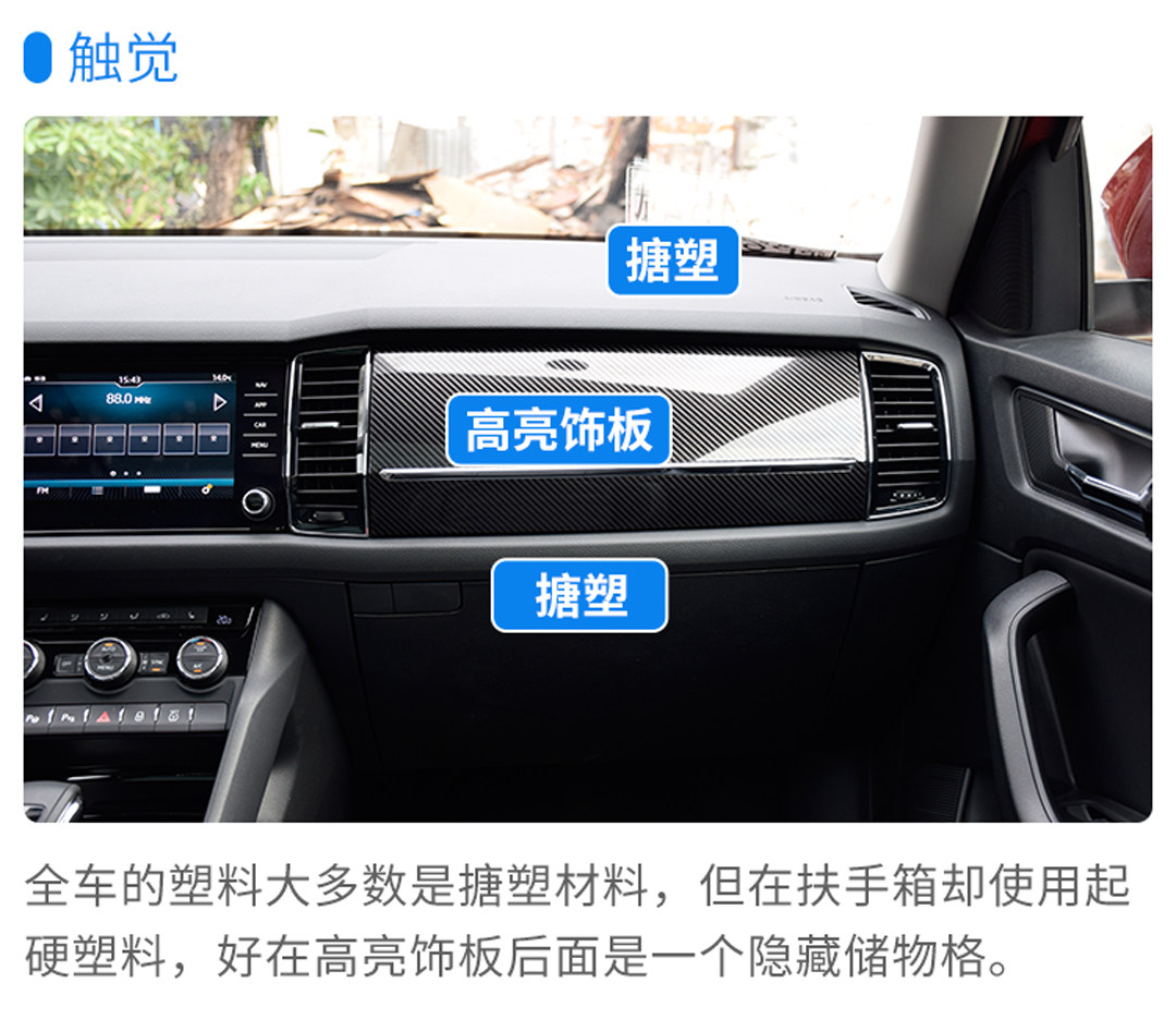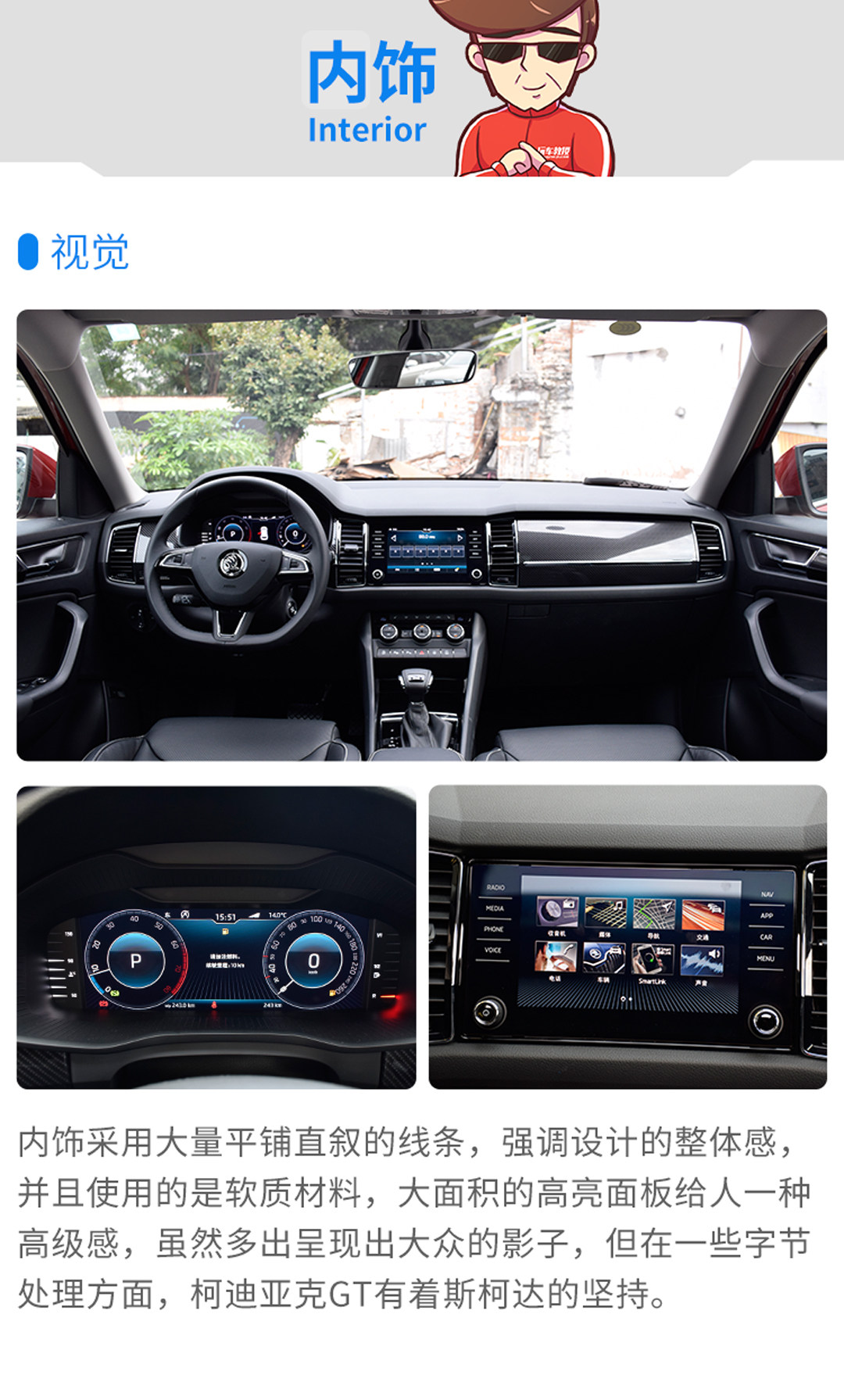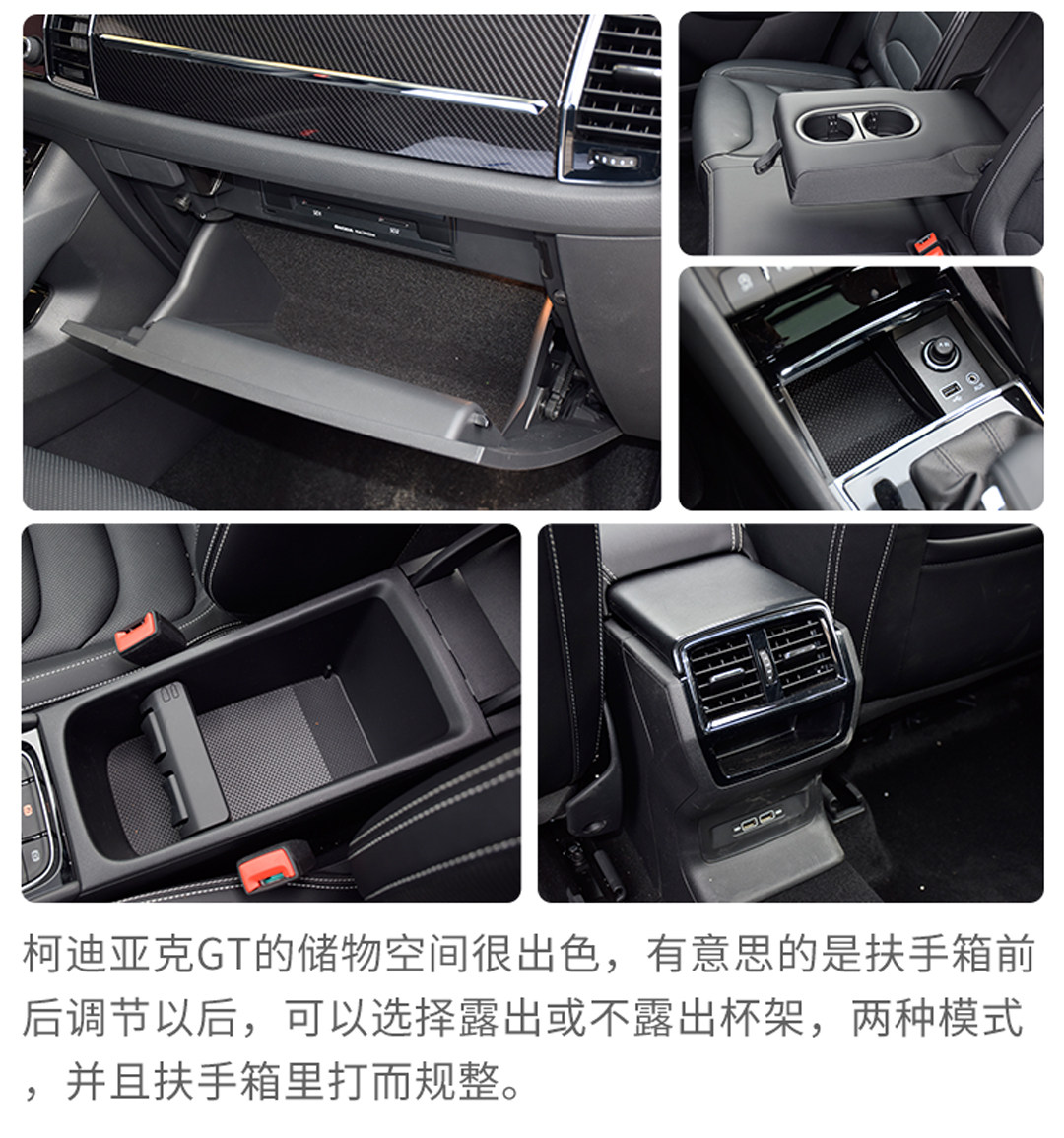 内饰方面,柯迪亚克GT离不开大众的影子,但总体上会比大众车型有设计感,例如在扶手箱处,可以通过调节扶手箱的前后,达到隐藏和显示杯架的功能;并且除了常规的储物空间以外,在副驾前方的碳纤维饰板后面也有一个容积较大的储物格,能够安放一些隐私的东西。