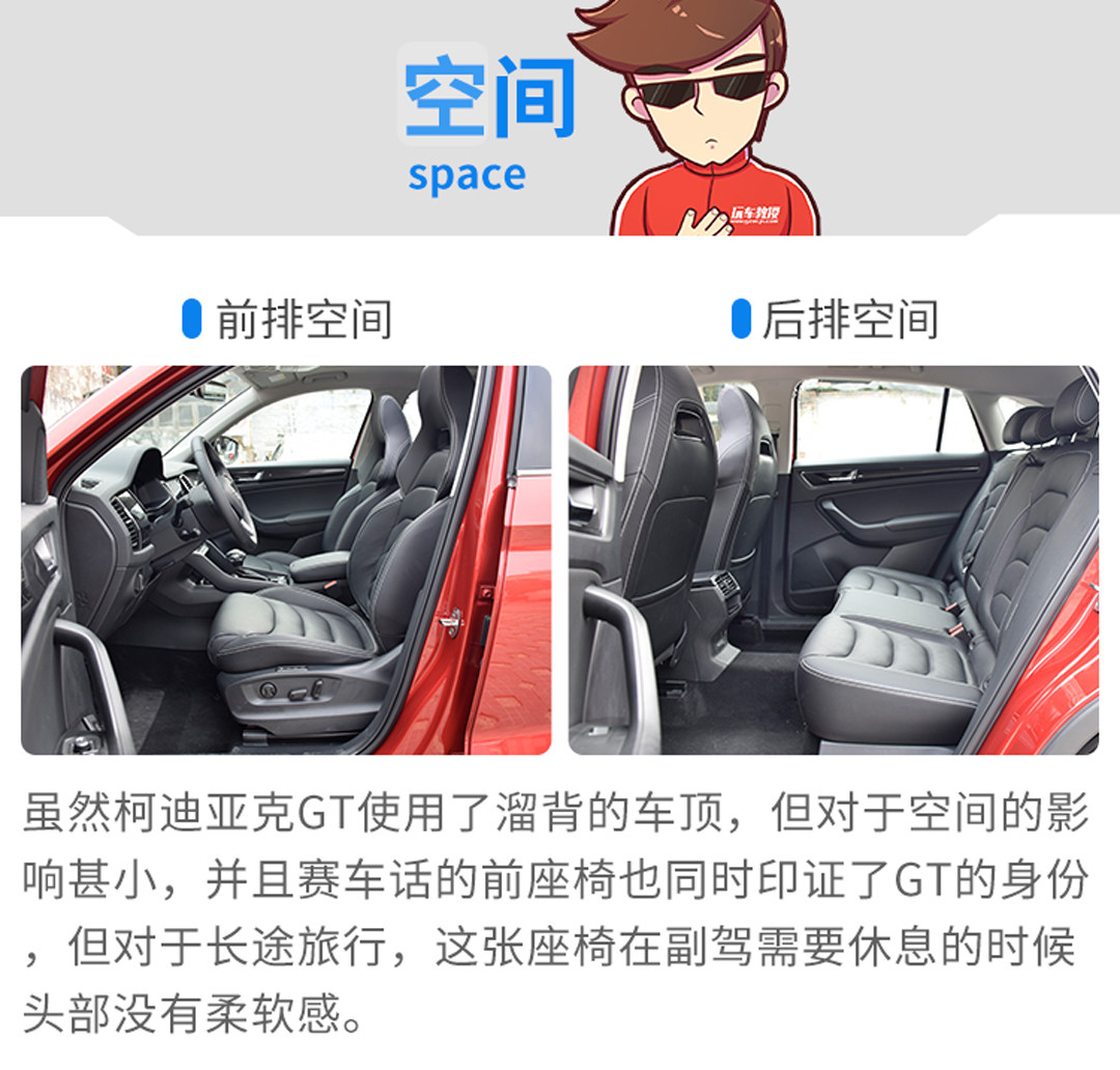 在空间方面,柯迪亚克GT有着SUV的实用性,并且在一些人性化的层面也做得很好;前后排的空间虽然不算夸张,但也相当充裕。