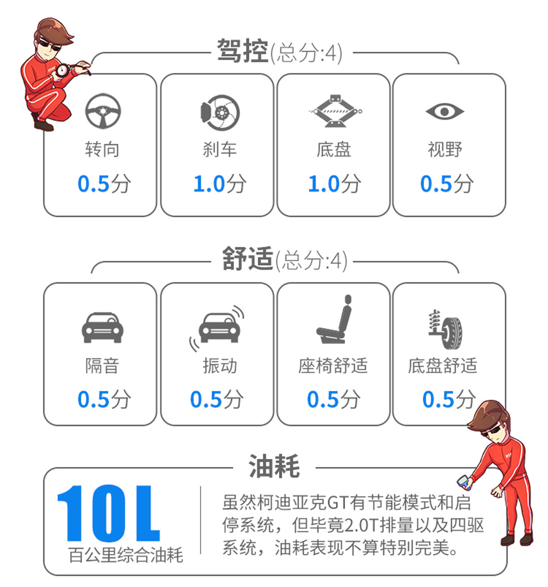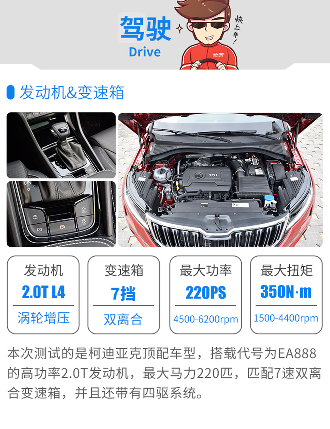 由于柯迪亚克GT是运动SUV的定位,所以相比起其他同级别传统SUV,柯迪亚克GT的底盘会偏硬,但教授会喜欢这种感觉,无论是上看还是下坎都相当精准,一次完成;但家人对于这种底盘属性也许会有一丝抱怨,长途行车细碎震动传到车内会让乘员不太舒服。