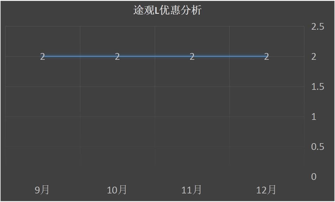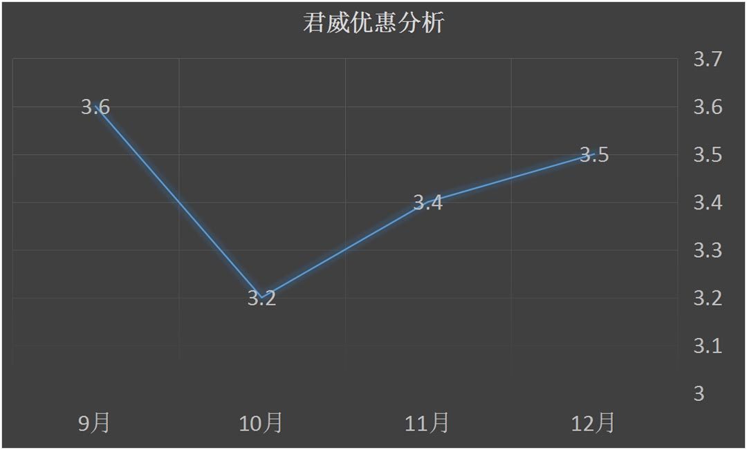 再来看一款中型车-君威几个月的优惠情况,9-12月期间优惠浮动在1000-4000元之间,而且12月份优惠也不是最大的。据教授从经销商处了解到的情况得知,别克目前君威(包括英朗、君越等车)厂家给出的优惠都比较大,再加上君威的国六车型目前没有优惠,国五版君威销量可观。像君威这种以价格换销量的车型目前的优惠都趋于稳定,更别说日系三强(凯美瑞等)这些价格坚挺的中型车了。所以在中型车里优惠也是稳定的。