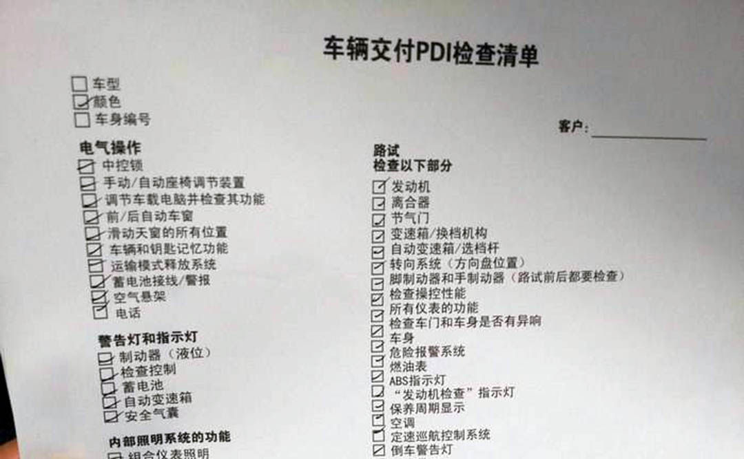 首先,在你检查之前,4S店当然也会自己先检查一遍,提前发现问题解决问题,这个专业一点叫做PDI(Pre Delivery Inspection),即车辆的售前检查。一般汽车在运输或者停放的时候,或者出厂之前就存在的问题,基本上都可以在这阶段检查出来并修复好,以确保交到消费者手中的是一台完整,没有问题的新车。