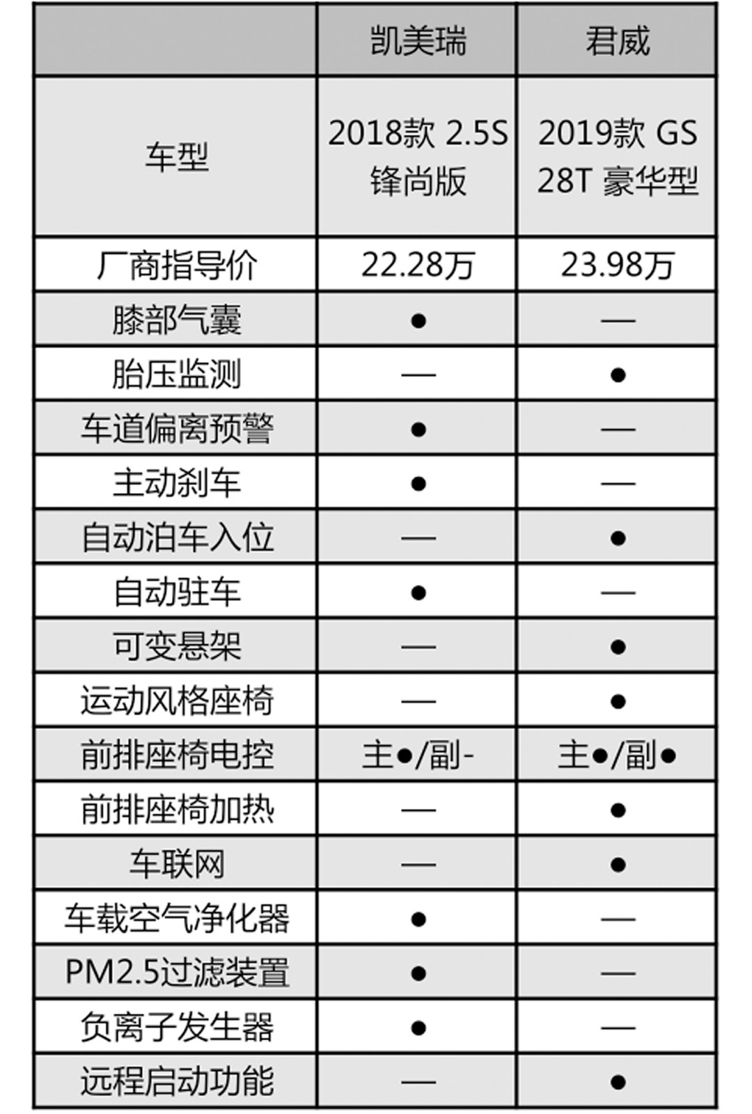 配置方面我们选用凯美瑞2.5S锋尚版以及君威GS 28T豪华型进行对比。在两款车售价相近的情况下,凯美瑞配有膝部气囊、车道偏离系统等多项高级安全配置,且带有PM2.5过滤装置、负离子发生器等,而君威GS在座椅功能、车联网等各项便利功能配置上更为全面。