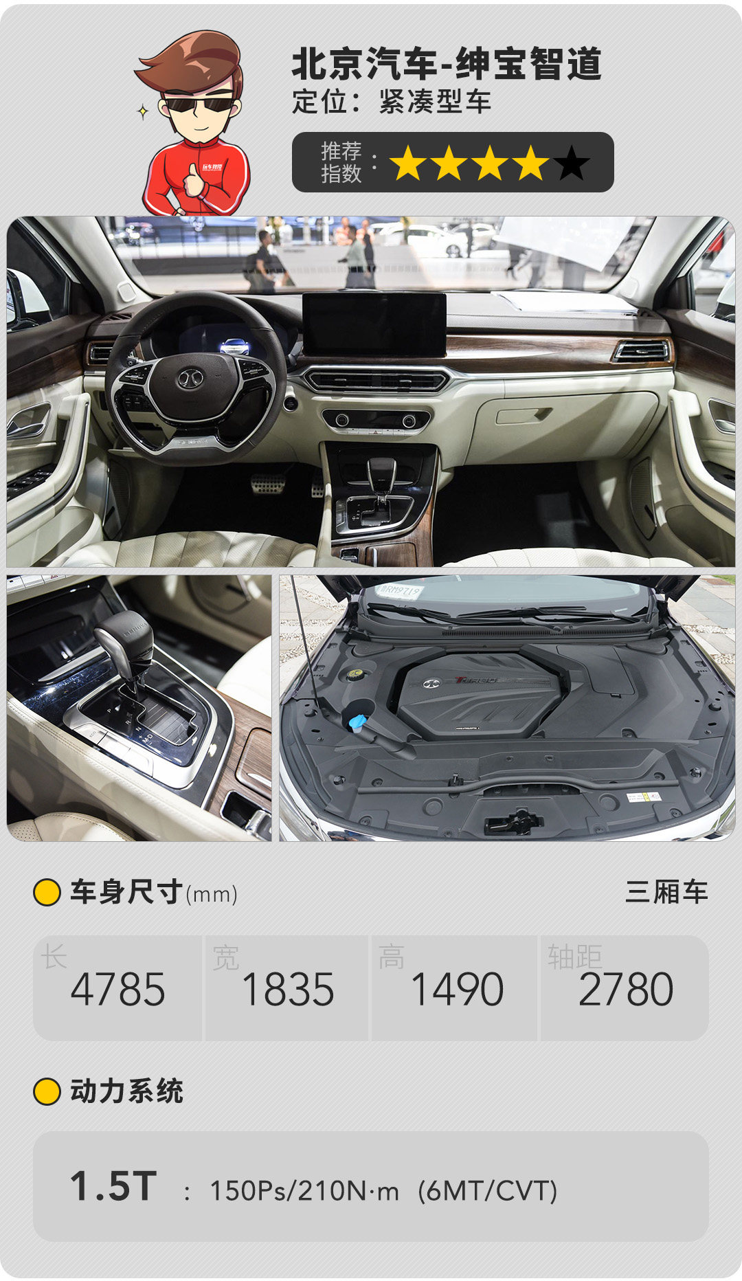 作为北汽2.0AI时代的首款轿车,绅宝智道采用了最新的家族化“offspace”前脸造型。拥有4785*1835*1490mm的三围和2780mm轴距的绅宝智道尺寸上比竞品更有优势。