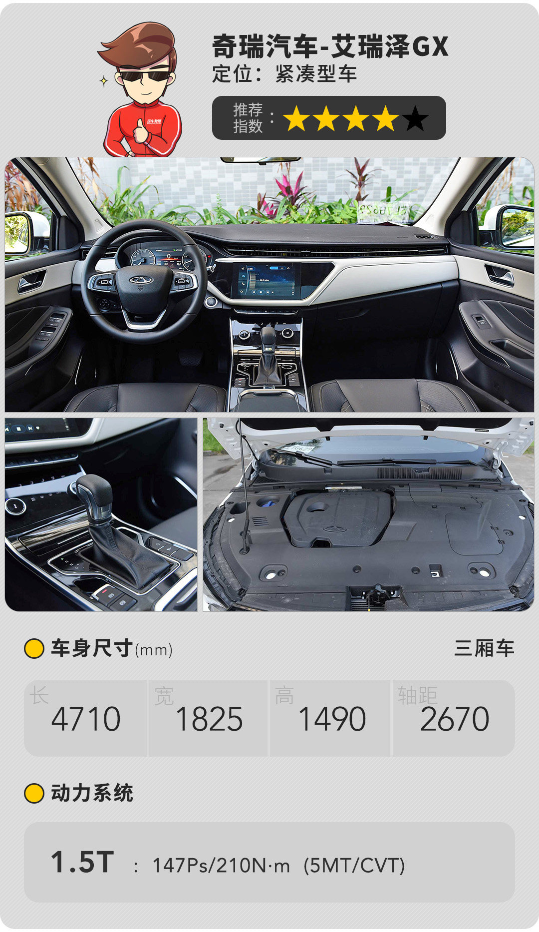 对于艾瑞泽GX,教授更愿意推荐的是车系的中配车型,售价为9.69万元的型色版 1.5T+CVT车型,一键启动+无钥匙进入、9英寸大屏、天窗、真皮座椅等配置均能在型色版车型上找到,作为车系中配车型,型色版的配置能满足绝大多数家庭的日常使用需求,同时,价格也十分具有竞争力。