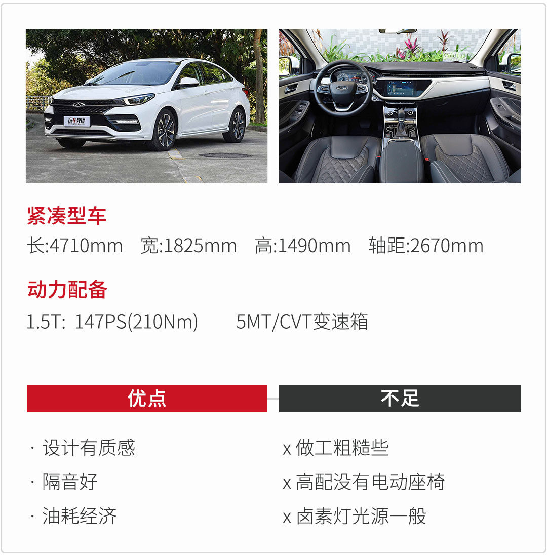 艾瑞泽GX,也是去年刚推出的一款紧凑型轿车,相比前面几款家轿,空间动力会更有优势些。设计质感有所提升,尤其是在内饰,精致感不错,看起来不错的前提下,也有较高的实用性。奇瑞更像是一个技术偏执,有点类似合资品牌的本田。奇瑞这款搭载的发动机也有些来头,发动机热效率高达37.1%,自动挡车型则是匹配了模拟9速的CVT变速箱。整体来说,奇瑞的三大件会更有优势,况且价格不贵,1.5T起步才7.49万,自动挡起步才8.99万。