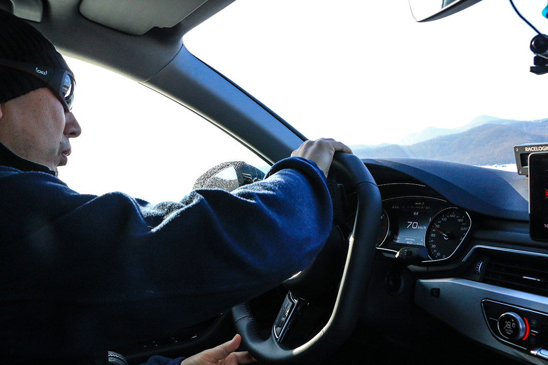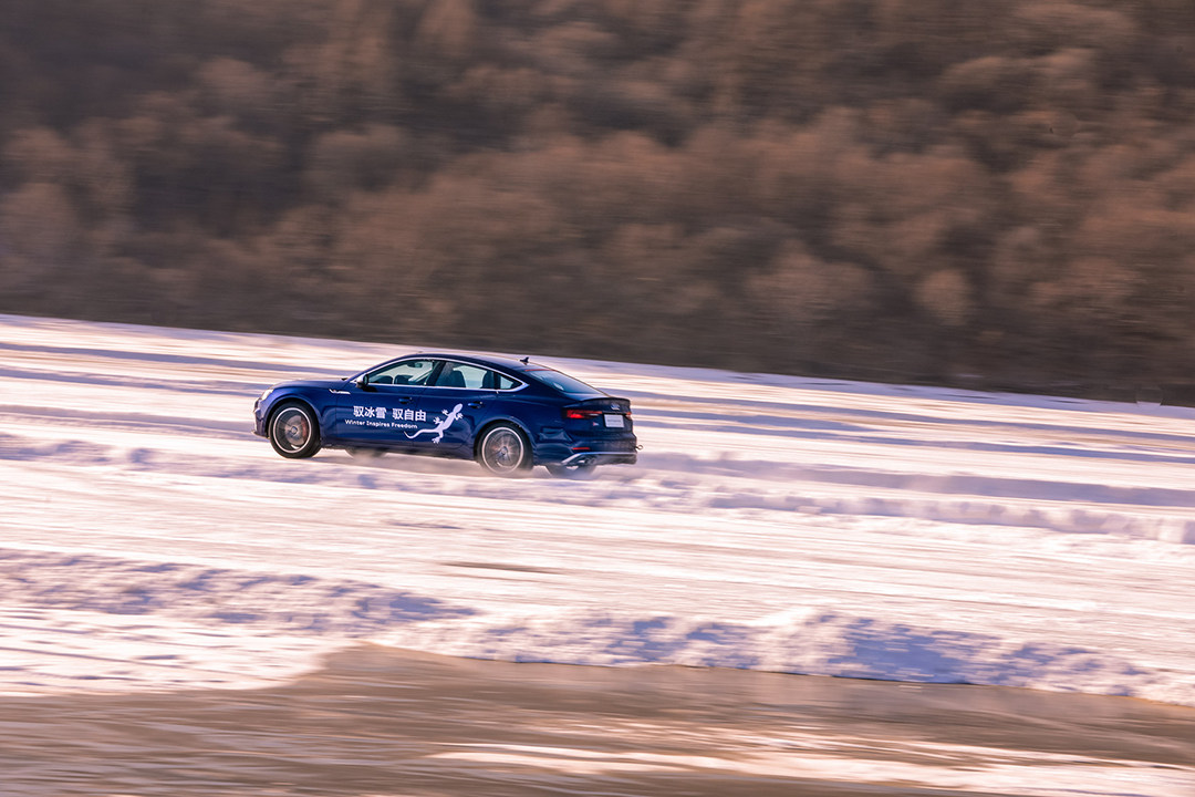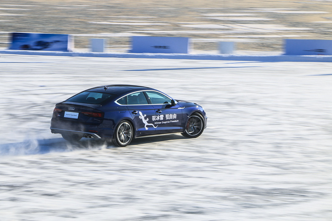 在冰面上的组合弯道中,为了尽可能地达到较快的速度刷圈,把ESC关闭一档,则开启了运动化模式化,在入弯前降到合理的20~30速度后,把油门顶到车尾动起来后,这时就可以把视线望向你想去的地方,轻微修正方向盘,不同于专业的飘移赛车,你无需考虑这时是哪个车轮在打滑,寻迹轨道会如何变化,剩下的会交给quattro帮你处理,并且只要速度不会太过分的情况下,大部分人都容易掌控,享受冰雪滑动的快感。