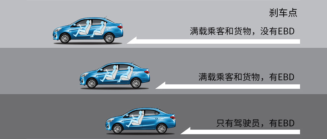 和ABS系统一样,轮速感应会在制动时感应到四个车轮不同的转速,根据转速会判断不同车轮的抓地力状况。于是会由行车电脑计算,将附着力较低一侧轮胎的制动力减弱,提高附着力较高的轮胎的制动力。因此可以在更复杂的驾驶状况和路况中,提供到较高的制动力,同时保证制动的稳定性,也能够提升行驶安全性能。由于EBD系统一般都需要和ABS系统一起发挥作用个,也有不少车会使用ABS+EBD的配搭。