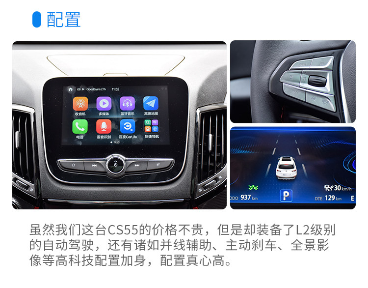 由于长安CS55采用了四轮独立悬挂,而且调教偏向于舒适,乘坐的舒适性还是相当不错的,作为一台家用车,CS55的表现足够让人满意;我们这台高配车型还配备了L2级的自动驾驶功能,在路面标线清晰且速度达到一定值时就可以开启,开启之后需要驾驶员注释前方,手不能脱离方向盘,体验下来这个L2级自动驾驶功能还是能够减轻一些驾驶员压力的,在平直的道路上自动驾驶能工作起来还算OK,但是这个功能更多地是应对封闭道路的,在大角度转弯、进出隧道以及前方车辆减速较快等情况时还是应付不过来。