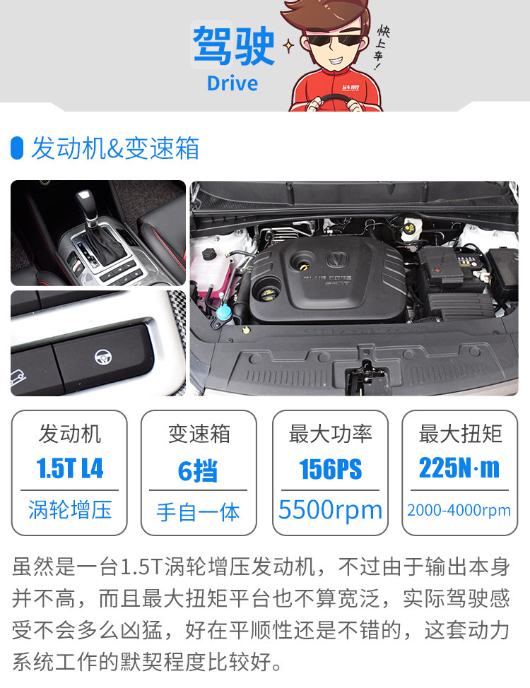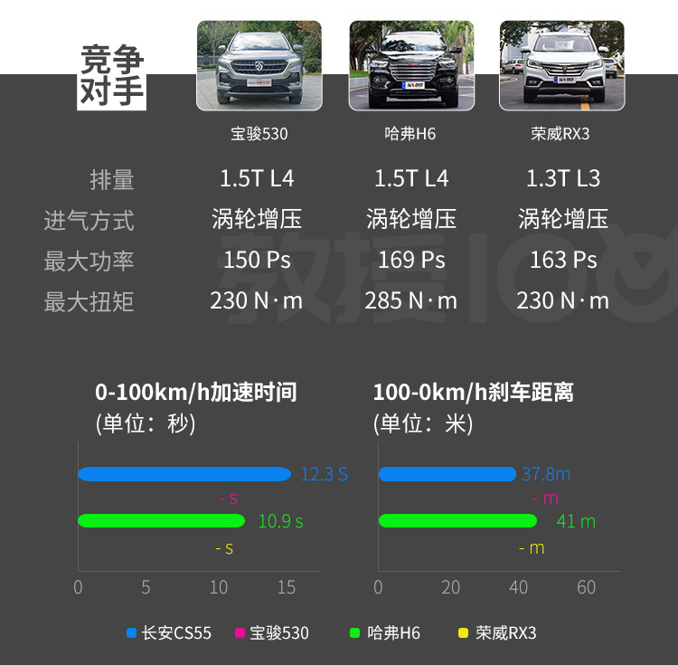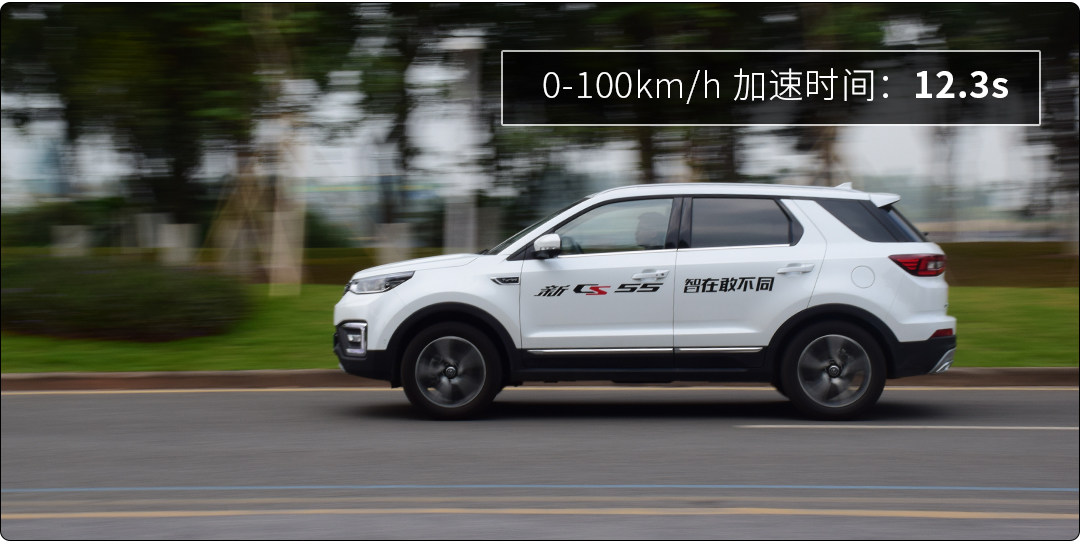 对比较竞品,CS55的1.5T发动机输出功率和扭矩都偏低,在加速测试中12.3秒的成绩也说明了这个问题,整个加速过程中CS55的加速力道并不足,虽然起步还算干脆,但是车辆的加速和换挡动作都比较慢,最终12.3秒的成绩相比哈弗H6也差一些。