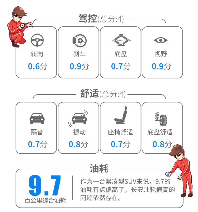 和加速时的疲软不同,CS55的刹车表现可以说非常出色了,作为一台紧凑型SUV,能够做出37.8米的刹车距离确实让我们很惊讶,这样的成绩比很多二三十万的车型都要出色,制动过程中CS55的表现也很安稳,车辆的点头现象在车内感觉不算明显,刹车表现非常出色。