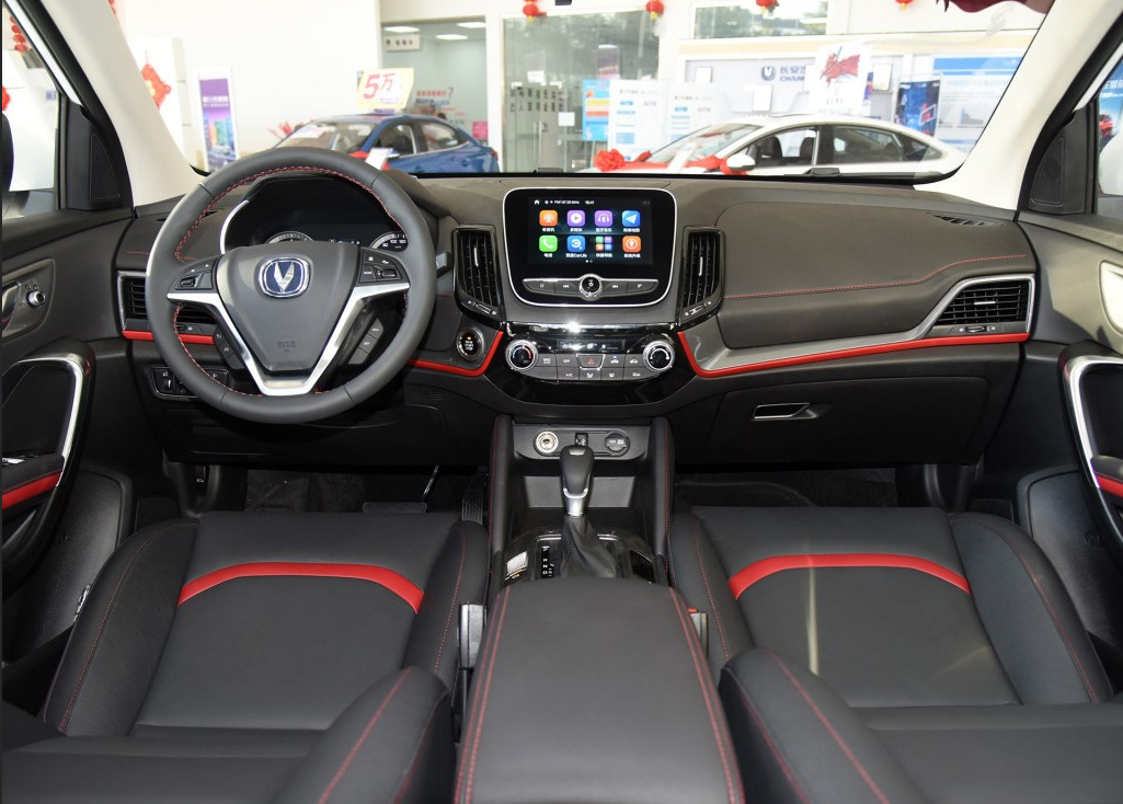 长安CS55的内饰很有福特车型的感觉,整体采用黑色的色调,虽然从整体样式来说不算新颖,但用料还比较厚道,中控台为软性材质包裹,这方面值得称赞,质感还是不错的,另外,红色+仿炭纤维装饰条的点缀,也不失为一种诠释年轻的直观而且效果不错的方式。