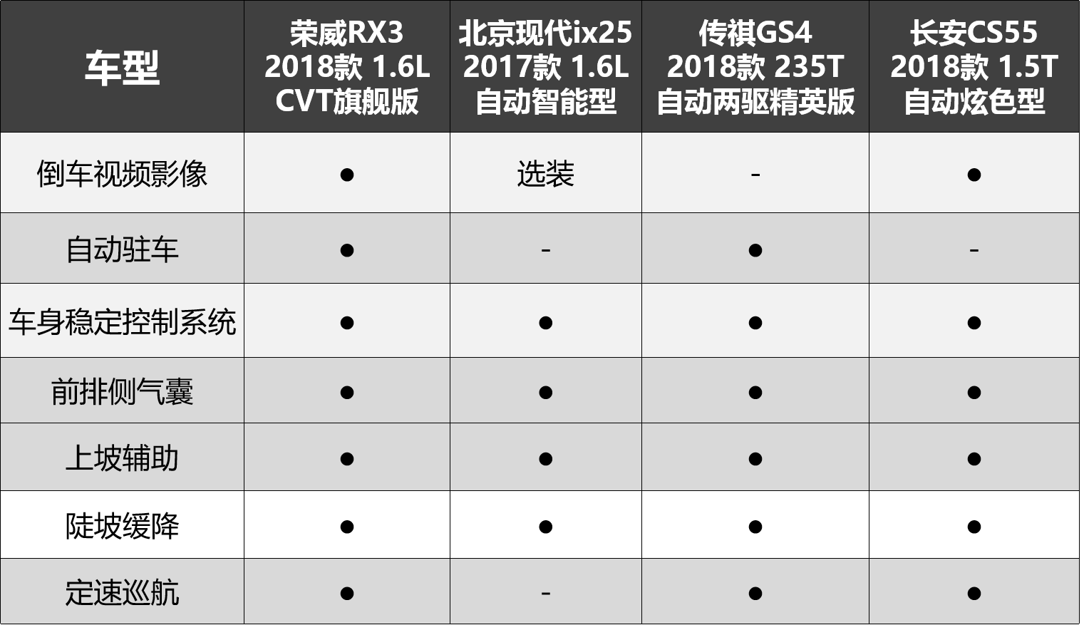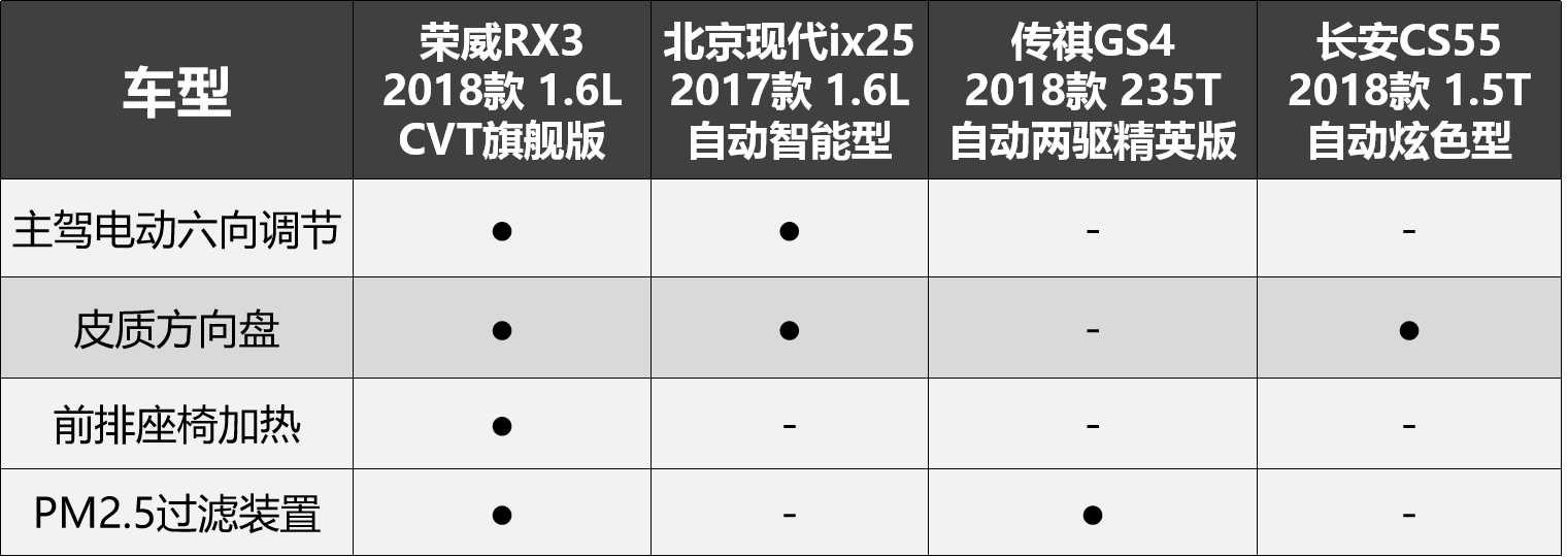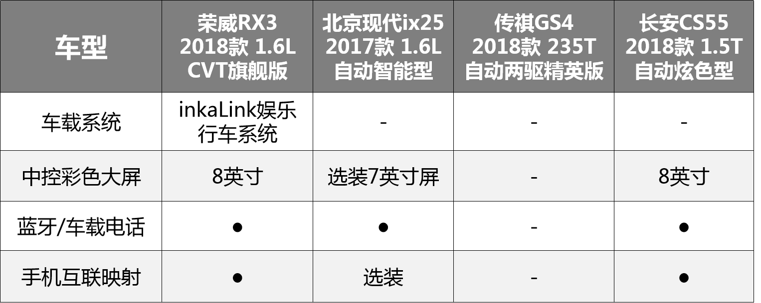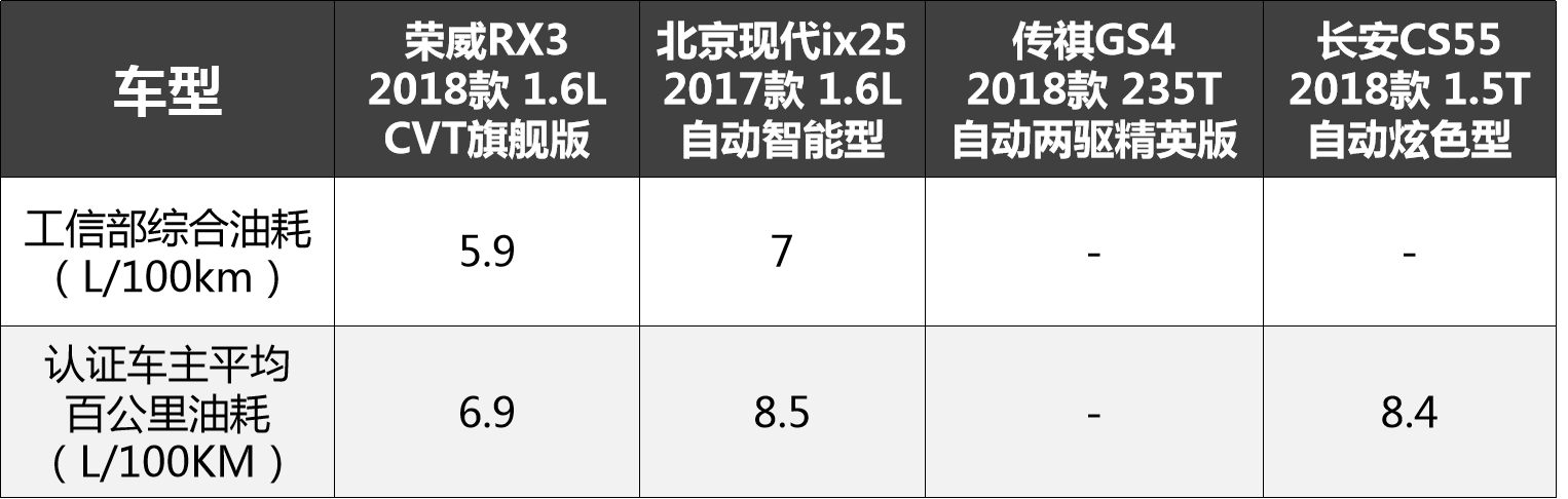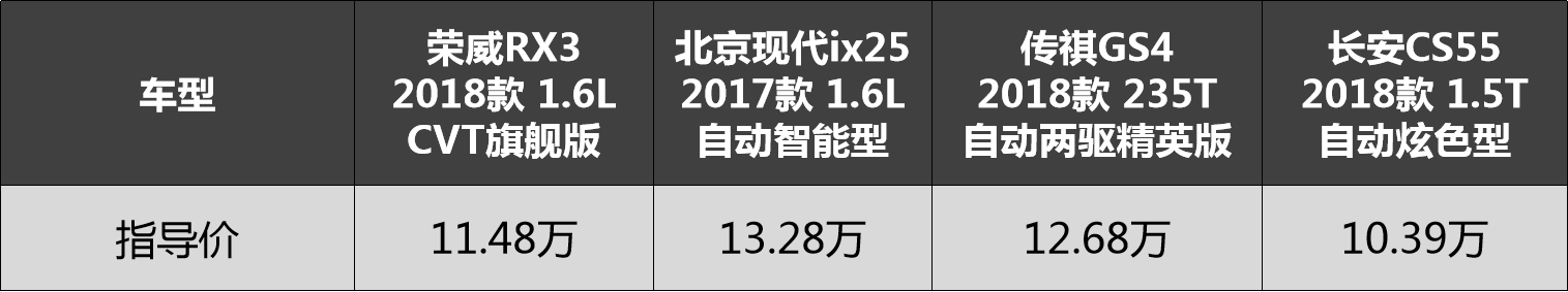 为此,我们选取几个车型当中价格相近的主销车型进行对比,分别为荣威RX3 2018款 1.6L CVT旗舰版(以下简称“荣威RX3”),北京现代ix25 2017款 1.6L 自动智能型(以下简称“北京现代ix25”)、传祺GS4 2018款 235T自动两驱精英版(以下简称“传祺GS4”)、长安CS55 2018款 1.5T 自动炫色型(以下简称“长安CS55”)。