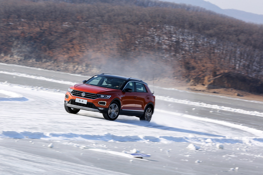 在“蛇形弯道”中,除了要控制好方向和油门以外,还要学会适当带一点刹车,好修正车辆入弯的姿态。在漂移过程中,大众探歌凭着低车身重心、精准的操控,能够轻易跳上一支“冰面华尔兹”舞步,同时在过弯时,底盘悬架也提供了不错的支撑性,并没有出现严重的侧倾。