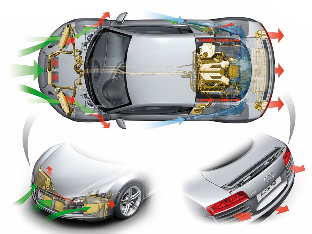 这时候可能有朋友会说,开个洞很难么。需要知道的是,空气的流动是严格控制和经过计算的,通过进气口的空气并不是自由散漫的乱吹一通,这样只会严重降低效率而且甚至有反效果,影响散热和空力性能。因此通过进气口的空气通常都有相应的导风部件,按比例导到需要使用流动空气的部分。这些部件都需要有背后的硬件、布局等配套支撑,是一个整体的设计工程,而不是简单的增减。