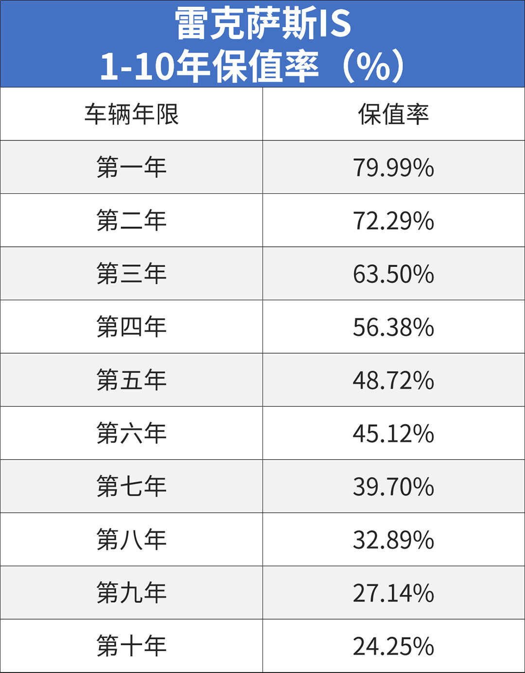 雷克萨斯IS市场表现凄凉,但综合实力还是值得认可,犀利运动的高颜值,出众拔尖的品质感、2.0T+8AT顺畅的动力性能优雅的操控以及活跃的底盘调校都给了它更加雄厚的实力,这也难怪即使备受冷遇,销量惨淡的它,首年还能够有近乎80%的优秀保值率,值得说的是这个成绩在众多同级深受冷遇的车型中那是非常的难得。对比分析其保值率来看,如若是选择二手的它,年限在三年内是比较好的,开两年,再次转手,依然能卖个不错的好价钱。