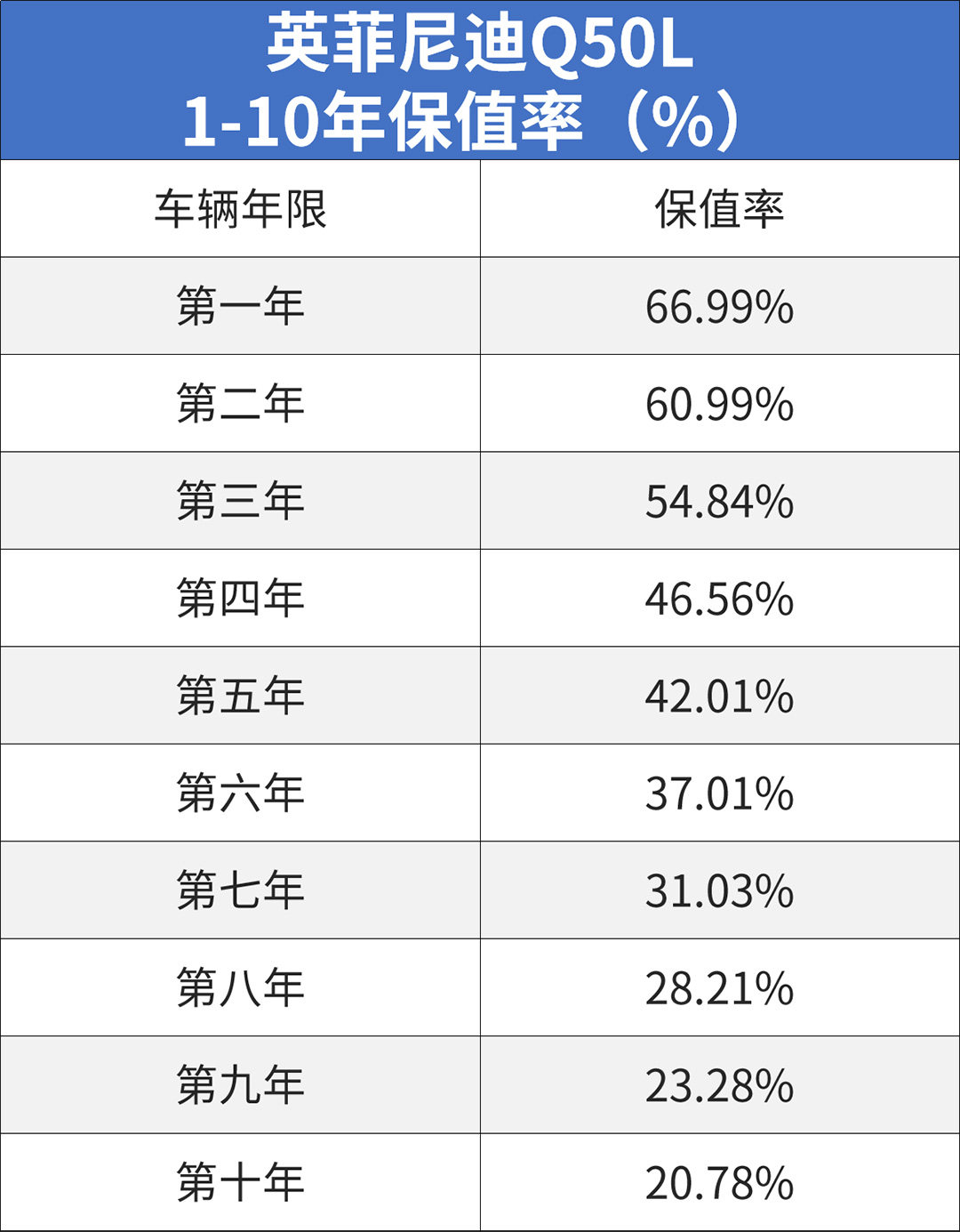 Q50L关注度以及市场表现都不咋的,首年的保值率也并不是很理想,但纵观前五年的保值率,这个成绩在二线豪华车中,算是处在中上游的水准,不算低档。当然,这个成绩离不开其自身过硬的产品力,舒适的悬架、平顺的换挡动作、经济的燃油性以及易于上手的转向都为它加分不少,只可惜,它的品牌影响力真的非常欠缺,在市场中面临的竞争对手又多,即使打折大优惠也无法改变它销量低迷的状态。