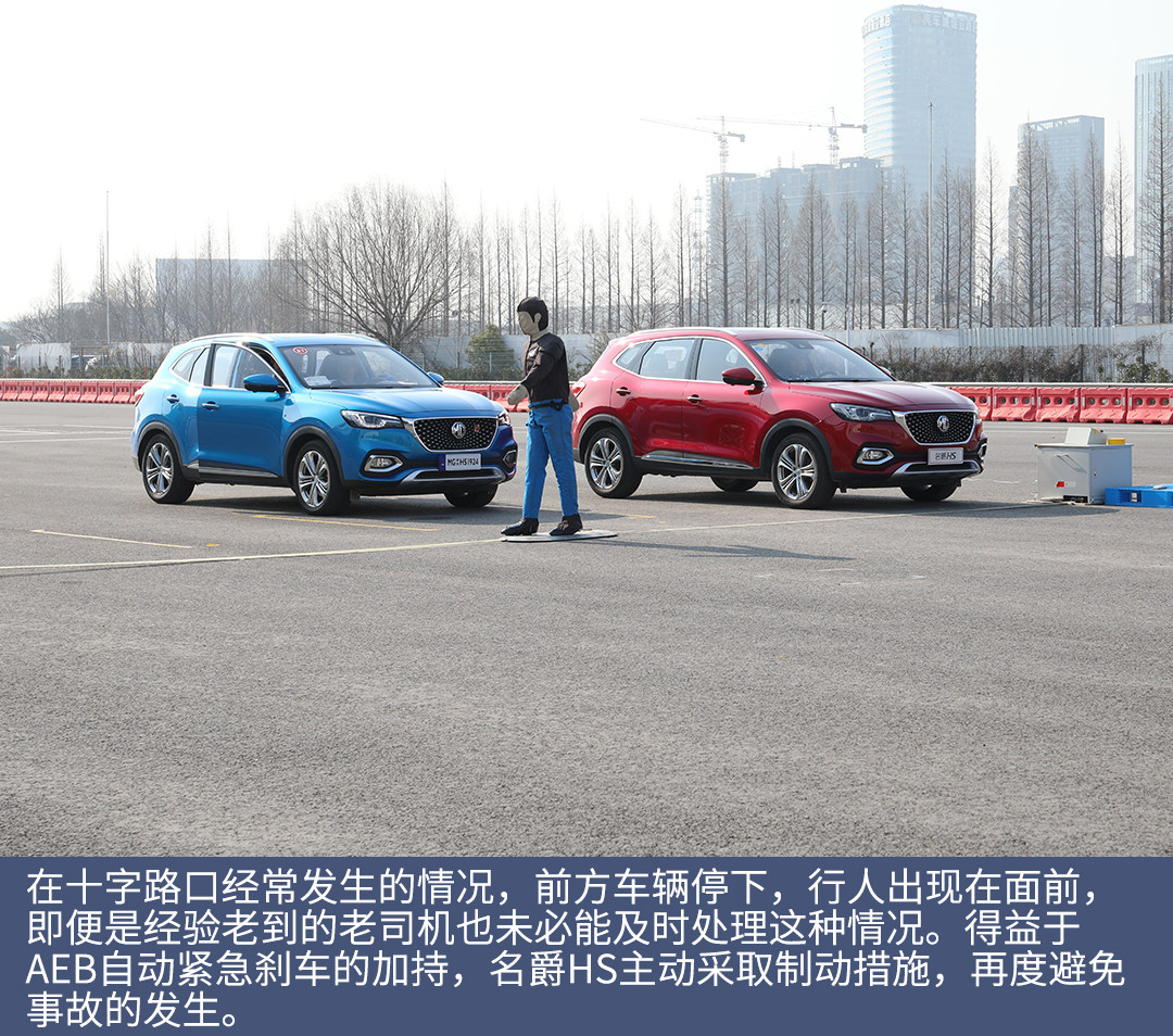 这种情况在十字路口转角处经常发生,前方车辆停下,行人出现在面前,驾驶位的司机很难及时处理应对。在ADAS驾驶辅助系统的加持下,名爵HS主动采取制动措施,避免了事故。