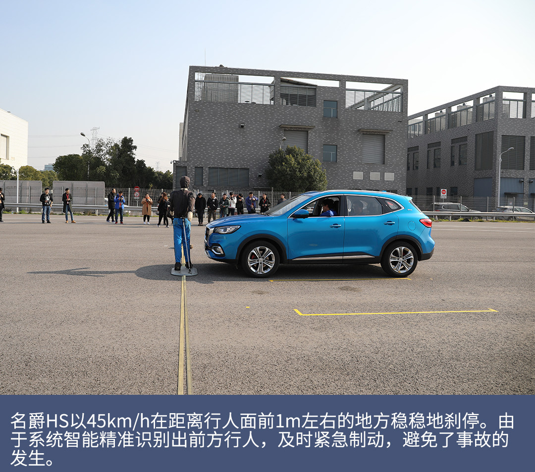 在系统智能精准的帮助下,名爵HS精准识别出前方行人,名爵HS以45km/h行驶,在距离“模特”面前1m左右的地方稳稳地刹停,避免事故的发生。