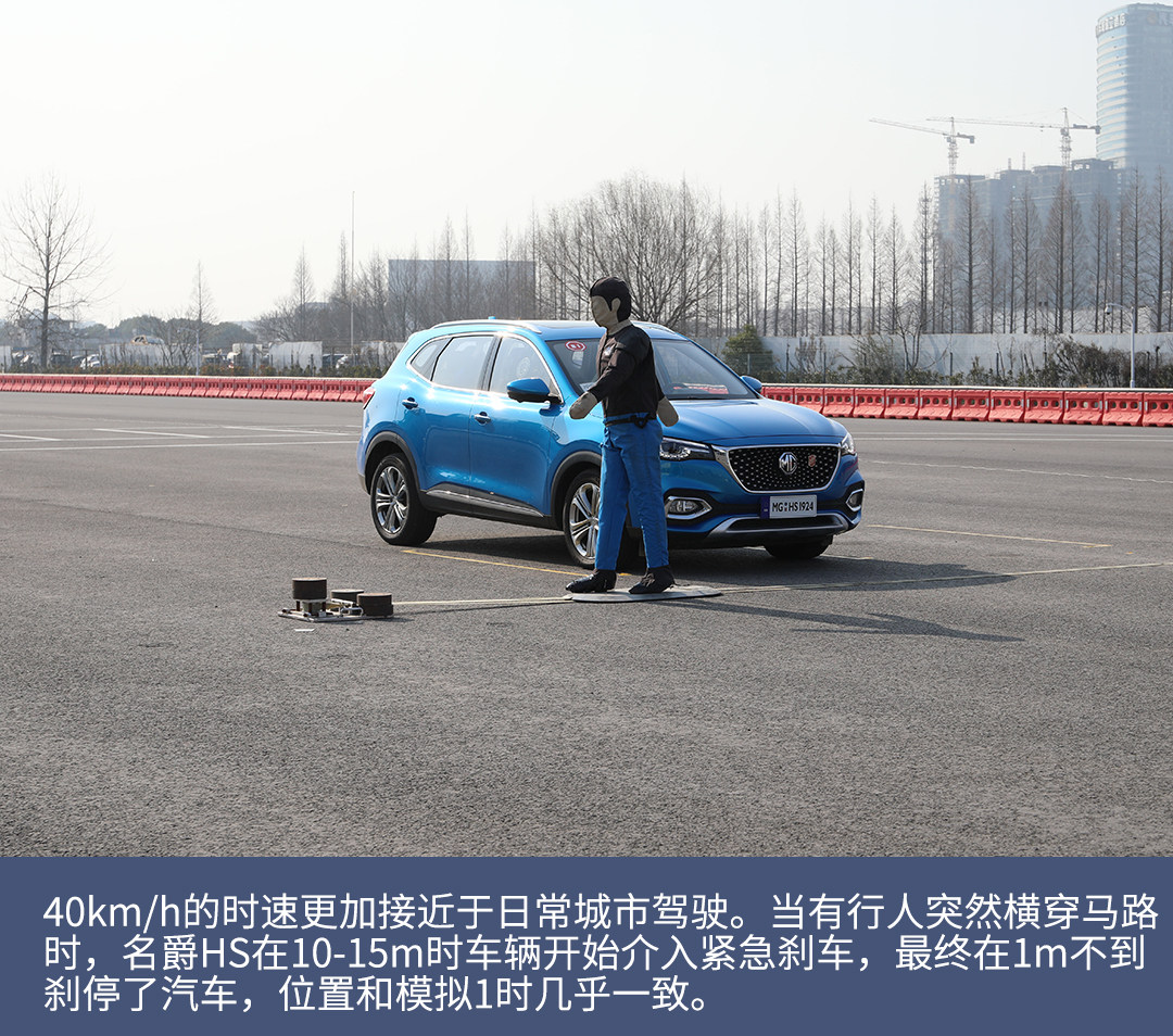 车辆时速40km/h的速度接近于日常城市驾驶。名爵HS识别出状况,在10-15m时车辆开始介入紧急刹车,距离行人1m不到的地方刹停了汽车。